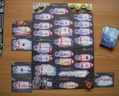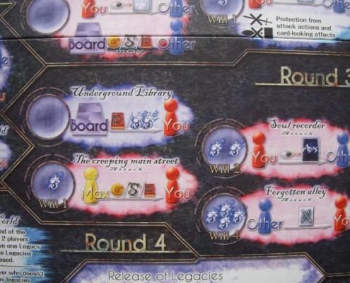 Gra jest w moim odbiorze zmieszaniem bardzo prymitywnego worker-placementu z ciekawym, trochę nonszalanckim pomysłem dedukcji, ukrytych celów i wyskakiwania jak filip z konopi rodem z Love Letter, czy serii Lost Legacy. Tak, czuć tu powiew zakręconej japońskiej myśli planszówkowej. Jednak tej oryginalności chyba nie wystarcza by pokryć przyciężkawy mechanizm główny: umieszczanie znaczników graczy na polach akcji kompletnie nieczytelnej planszy. No właśnie, największym chyba grzechem tej gry jest niestety jej wykonanie. Ikonografia planszy zabija cały klimat, który twórca próbuje przemycić w nazwach lokacji (możemy udać się do miejsc opisanych jako: „Where the lights sink”, „Forgotten alley”, „Tree of heaven”, czy „Soul recorder”). Symbole na planszy z trudem dają się jednak odczytać; bez trzymania w ręku instrukcji z opisem poszczególnych pól rozgrywka jest praktycznie niemożliwa. Rozplanowanie planszy godne jest co najwyżej wczesnego prototypu; dodatkowo do każdej rozgrywki wchodzi kilka kart z dodatkowymi lokacjami, które po prostu umieszcza się… obok. W sumie nie mam nic przeciwko prototypom, o ile są czytelne. Ten nie jest. Bardzo to utrudnia rozgrywkę, wprowadzenie do niej graczy. Jeśli jednak nowemu wydawcy uda się tę planszę całkowicie przemodelować, wpuścić na nią choć odrobinę klimatu, może nawet sprawić by była graficznie atrakcyjna – czy wtedy gra znajdzie sympatyków? Znów mam tu ambiwalentne odczucia.
