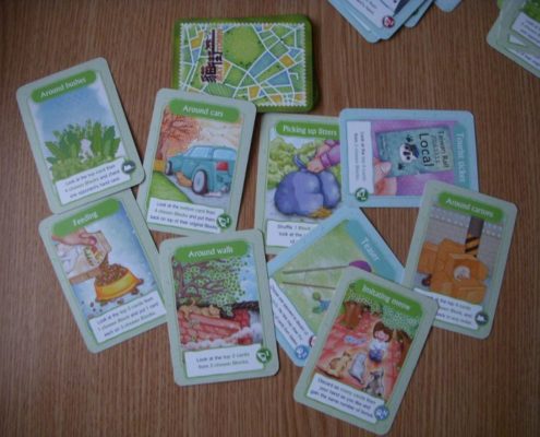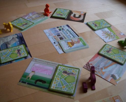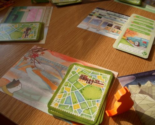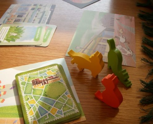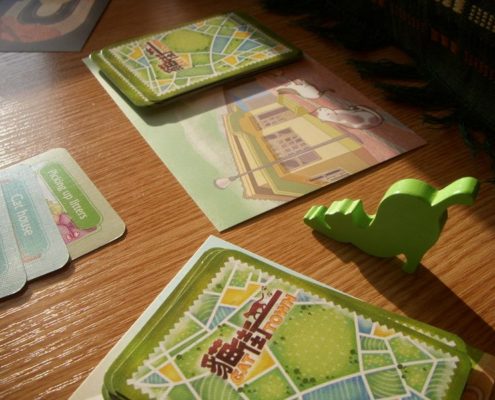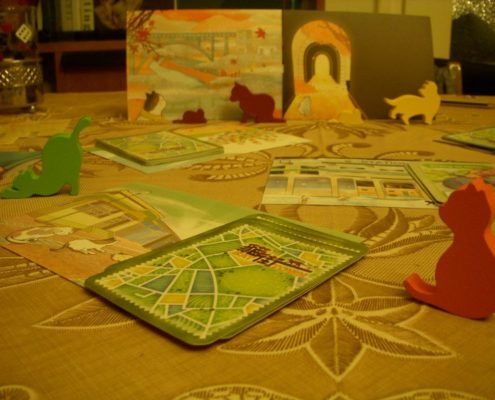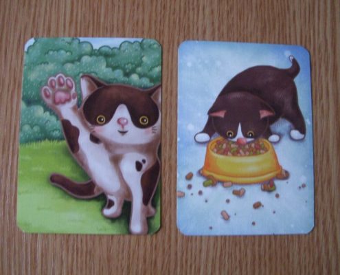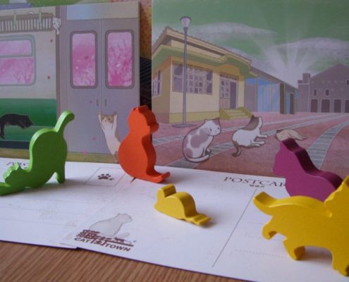Dla mnie Cat Town jest również grą całkiem klimatyczną i fajnie prezentującą trud nawoływania i poszukiwania ulubionego kota wśród zaułków miasta. Trudno nie zachwycić się przeuroczymi ilustracjami kart i nie docenić pomysłu przedstawienia lokacji miasta na prawdziwych pocztówkach z odciskiem kociej łapy w miejscu na znaczek. Nie spotkałam jeszcze osoby, która przy pierwszym kontakcie z grą nie bawiłaby się figurkami kotów i myszy.