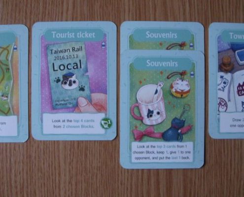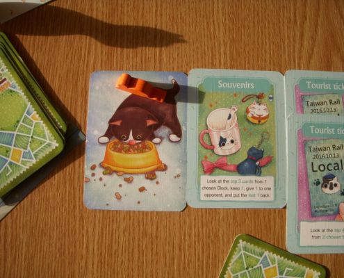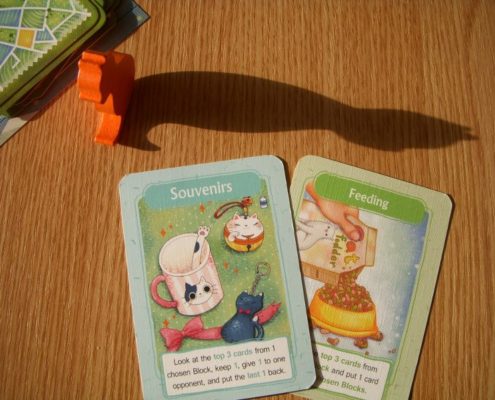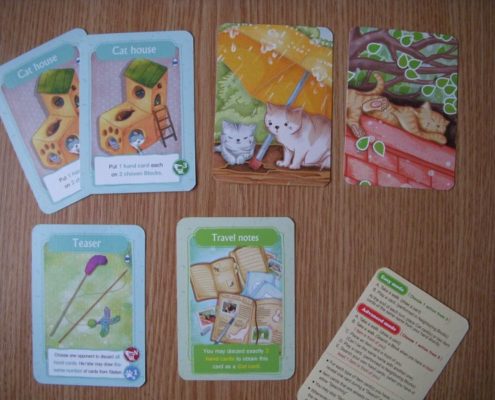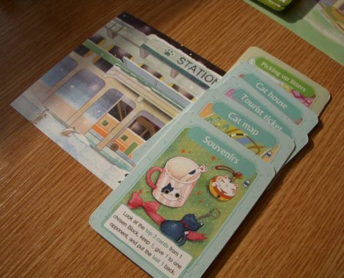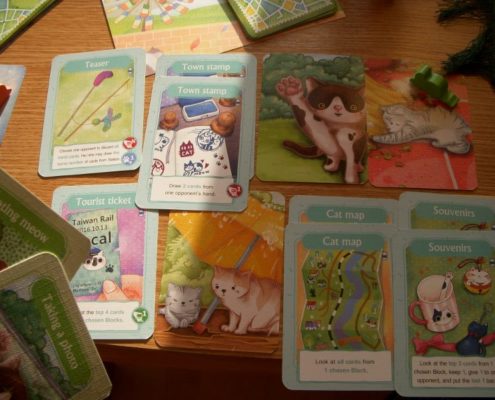 Podstawą dobrze poprowadzonej rozgrywki jest znajomość efektów i możliwości kart akcji i przedmiotów. Cała zabawa płynie z kombinowania kolejności zagrywania kart, prób zdobycia i zapamiętania wielu informacji o znajdujących się w poszczególnych stosach kartach, zanim przejdzie się do ich zdobywania czy wykładania przed sobą. Warto w Cat Town grać bardzo świadomie, unikając losowości polegającej na łażeniu po mieście i odkrywaniu na chybił trafił wierzchnich kart. Fakt, że na upartego można rozegrać całość w ten zupełnie losowy sposób, psując tym rozgrywkę przede wszystkim samemu sobie. Jednak esencja gry polega na próbach wyeliminowania tej losowości i takim rozegraniu partii, by większość działań była absolutnie celowa. Podoba mi się to, że fakt posiadania na ręce pasującej nam karty przedmiotu lub kota niczego jeszcze nie determinuje. Nie tak łatwo jest bowiem wyłożyć ją przed sobą – pozwala na to tylko jedna z akcji, w której to przeciwnik losuje kartę z naszej ręki za nas. By wykonać taką akcję musimy więc być do niej przygotowani zrzucając uprzednio wszystkie karty – śmieci. Z drugiej strony próbujemy mieć na ręce ciekawe karty akcji pozwalające jak najszybciej zebrać wiele informacji. Czasem potrzebujemy zebrać ich kilka, by móc skorzystać z własności specjalnej karty Travel notes, dającej nam punkt za zrzucenie z ręki trzech kart naraz. Zastanawiamy się, czy wykładać karty przedmiotów przed sobą dla zdobycia punktów, czy też skorzystać z ich dość mocnych efektów zagrywając je jak karty akcji. Przy tym wszystkim ścigamy się z przeciwnikami, obserwujemy ich miny w trakcie przeglądania stosów kart i dedukujemy: czy ten rozanielony uśmiech oznacza, że właśnie zobaczyli kota?