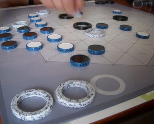 PŰNCT wydaje mi się najbardziej mózgożernym przedstawicielem całej serii. Jednocześnie nie brak mu elementów zaskoczenia, gdy to gracz będący o krok od zwycięstwa nagle zmienia się w gracza próbującego powstrzymać przeciwnika. Czasem jeden zgrabny obrót pozwala zmienić całą sytuację. Musimy myśleć naraz o dwóch możliwych sposobach zakończenia rozgrywki: próbując stworzyć połączenie na planszy, wciąż pamiętamy o konieczności zachowania przewagi w części centralnej. To gra inna niż wszystkie: poczynając od dziurawej planszy, fantazyjnych kształtów pionów, po przestrzenną zabudowywaną w górę stertę elementów, które co rusz blokują lub odblokowują siebie nawzajem, a wszystko obraca się zawsze wokół tych niepozornych punktów… Fenomenalny tytuł. Choć, uwaga! – chyba najmniej doceniony spośród gier tego projektu.