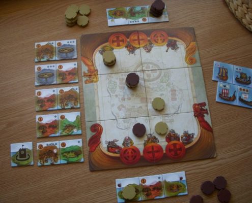 Kolejna wariacja na temat tworzenia i dzielenia stosów. O Vikingdoms, która zdążyła już zadomowić się w Polsce jako Królestwa Wikingów pisałam kiedyś krótko na swoim blogu. Przypomnę więc tylko, że tworzymy tu stosy, które w zależności od swojej wysokości poruszają się jak różne figury szachowe. Część logiczną rozgrywki wygrywa osoba, która jako pierwsza utworzy stos sześciu elementów z własnym kolorem na wierzchu. Lecz to dopiero początek gry! W tym momencie bowiem przechodzimy do części tematycznej, odnajdujemy się w świecie wikingów i zdobywamy nowe kafle terenu, budujemy własne terytorium, grabimy monety, więzimy piony rywala lub zdobywamy sojuszników.