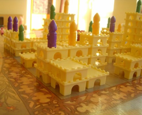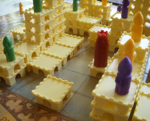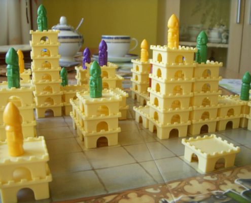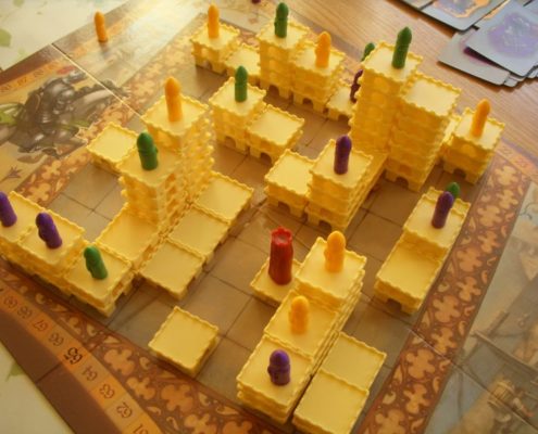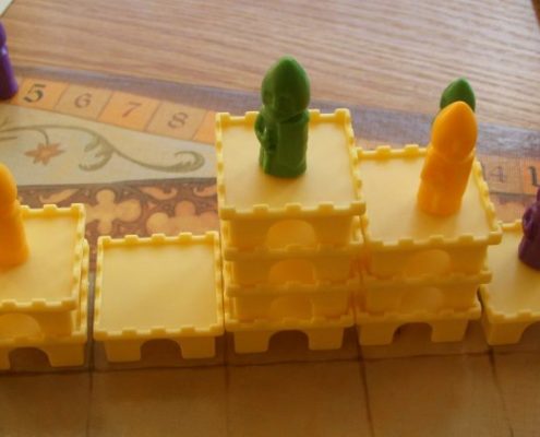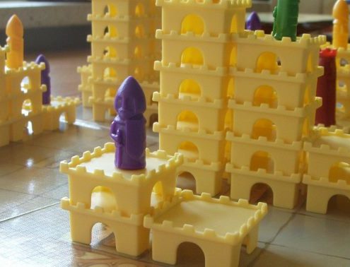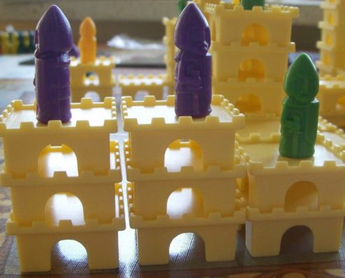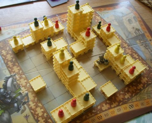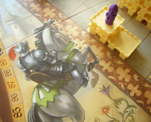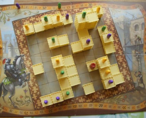 Tak samo ujmuje mnie za serce aspekt przestrzenny tej gry. Uwielbiam trójwymiarowość w grach. Wznoszenie zamków z malutkich segmentów daje prawdziwą frajdę. Budowanie ich tak, by stworzyć schodki dla swojego rycerza, by zablokować rozwój zamku rywali, by zmaksymalizować liczbę punktów, którą zdobędzie rycerz na szczycie – niezmiennie mnie bawi, ale wymusza też trudne decyzje i konieczność przeliczenia wszystkiego.