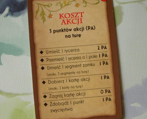 Torres nie ustępuje im pola. Też ma swój charakterystyczny sznyt. Dla mnie jest nim pewna awanturniczość rozgrywki, chyba najmocniej tu podkreślona. Rycerze bez pytania i z butami wchodzą po prostu do dowolnych zamków, próbując ugrać w nich jak najwięcej dla siebie. Gracze niby budują coś razem i dokładają segmenty wież do różnych zamków, ale gdzie tam, nie ma zmiłuj, każdy myśli o sobie. Niektóre zamki mogą być nawet porzucone, gdy ograniczy się ich potencjał; inne, te rokujące, mogą przeżywać istne oblężenie. Prawdziwy skok na zamek dokonany przez graczy widzących szansę, by wspiąć się jeszcze wyżej lub rozbudować podstawę zamku. W trakcie rozgrywki na okrągło ćwiczymy tabliczkę mnożenia, przemnażając podstawę razy wysokość i kalkulujemy jak najszybciej zdobyć przewagę nad przeciwnikami. Przewagę tę możemy zdobyć wykorzystując nawet nielegalne zagrania – te pochodzące z kart akcji.