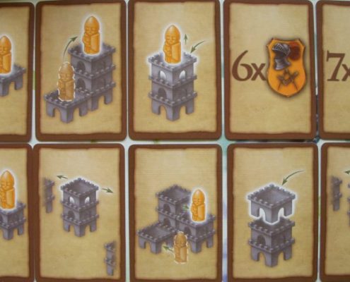 Niektóre z kart mistrzowskich pomagają zdobyć dodatkowe punkty na końcu każdej z faz punktowania, inne tylko na końcu gry. Mi bardzo spodobały się warunki na nich przedstawione, które często dodatkowo podkreślają przestrzenny aspekt gry. Są karty pozwalające zdobyć punkty za wszystkich rycerzy gracza umieszczonych na identycznym poziomie, w jednej linii, na obrzeżach planszy lub w formacji kwadratu. Wprowadzenie karty mistrzowskiej do gry wymusza inne myślenie, każe graczom oduczyć się starych schematów prowadzenia rozgrywki w Torres. Bardzo odświeża grę i podkreśla jej trójwymiarowość.