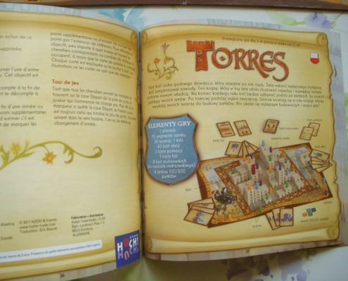 Torres to gra abstrakcyjna, choć opatrzona jest krótkim wstępem fabularnym. Są rycerze, stary król, jakieś zawody o tytuł najlepszego budowniczego. Słowem, temat jest całkowicie pomijalny. Nie doświadczamy go w trakcie rozgrywki, ale niczemu to nie przeszkadza. Wręcz przeciwnie: sądzę, że lepiej by było wprowadzić do gry tradycyjne drewniane piony, nie próbujące udawać rycerzy. Dodałoby to powagi tej klasycznie pięknej grze i byłoby dużo bardziej praktyczne. Plastikowe figurki rycerzy są bowiem zbyt lekkie, a do tego ich kształt powoduje, że co rusz spadają z wysokich wież i turlają się gdzieś tam pomiędzy zamkami. To właściwie jedyny mankament związany z wykonaniem gry, bo reszta elementów robi naprawdę dobre wrażenie. Zarówno jakość kart, segmenty z których budujemy zamki, pomoce gracza, ikonografia, sposób napisania instrukcji – wszystko wykonane jest na dobrym poziomie.