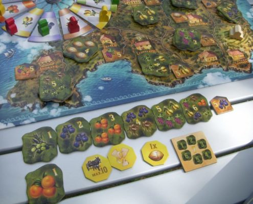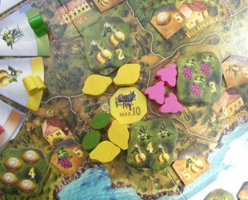 Przekroczenie odpowiednich linii na wiatracznym kole pozwala nam zdobyć osiołka – wraz z wozem, którym dostarczymy zebrane owoce do gmin hiszpańskiej wyspy. Plansza przedstawia gminy wraz z żetonami popytu, jaki zgłaszają na wybrane owoce. Są to od 1 do 6 owoców w różnych konfiguracjach. Jeden osiołek pozwoli nam dostarczyć do 6 owoców jednej lub kilku gminom. Zdobyte żetony popytu są jednocześnie punktami zwycięstwa na koniec gry, a dodatkowo gracze mogą z nich tworzyć kolekcje (rosnącymi wartościami od 1 do 6) by zdobyć kolejne punkty zwycięstwa. By tego było mało, gminy których popyt został całkowicie zaspokojony (zabrano wszystkie żetony) oferują dodatkową nagrodę – żeton finki, przyznający punkty zwycięstwa graczowi, który w danym momencie zebrał najwięcej ikon owoców danego rodzaju na wszystkich posiadanych żetonach popytu… I znów, można tę grę rozgrywać na luzie ciesząc się tylko kolekcjonowaniem żetonów i wysyłaniem kolejnych osiołków w drogę, a można wcześniej planować, które gminy zaopatrywać częściej. Gra nie jest wolna od losowości, w drogę wchodzą nam też czasem przypadkowe działania innych graczy, ale i tak Finca pozwala na całkiem przyjemne optymalizowanie nie tracąc nic z lekkości tematu.