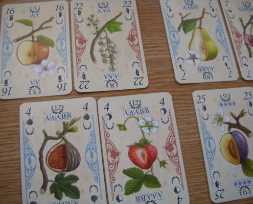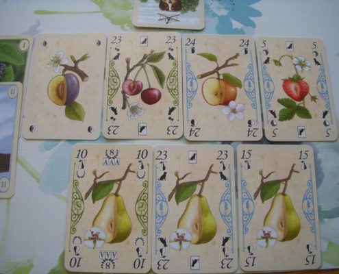 Zdobywane karty owoców są bardzo różnorodne i bardzo atrakcyjne. Te najcenniejsze posiadają ikony punktów zwycięstwa jakie zdobędziemy za stworzenie widniejącej na nich kolekcji owoców. Są to różne kombinacje owoców jednakowych, różnych lub zestawów par. Karta owocu z ikoną kolekcji może być częścią tej kolekcji, ale nie musi. Doskonale działają też akcje specjalne wykonywane natychmiast po zebraniu karty z ich ikoną ze stołu. Złodziejstwo pozwala ukraść przeciwnikowi wyłożoną kartę owocu, pies chroni nas przed złodziejami, a karty Pi pozwalają zwiększać wartość zagranej na stół karty podczas licytacji (o 3,14).