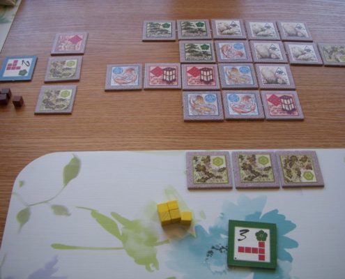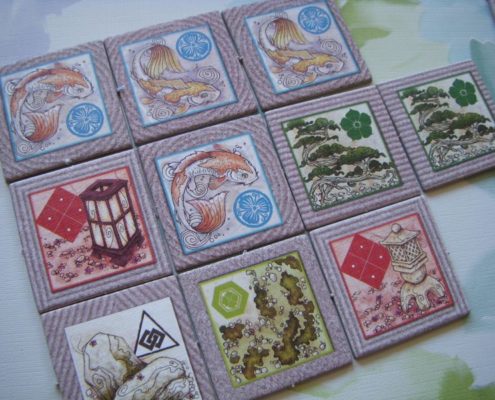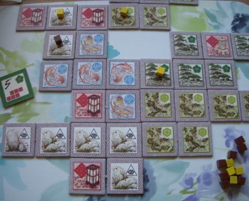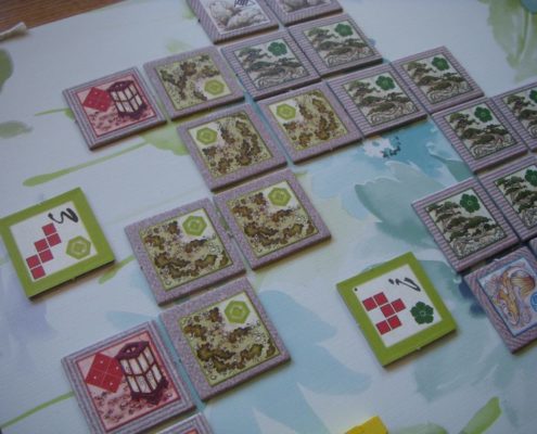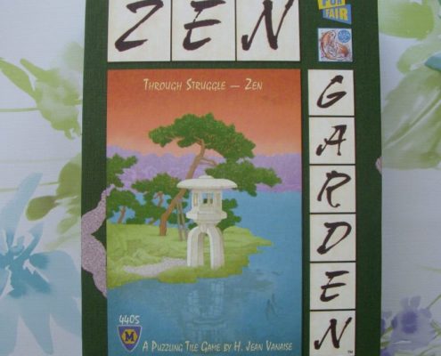 Zen Garden to niewielka gra kafelkowa przeznaczona dla 2 do 4 graczy na mniej więcej 20 minut rozgrywki. Jej autorem jest bliżej nieznany projektant, H. Jean Vanaise, a sama gra może być rozgrywana na dwa sposoby: podstawowy Zen Garden, i bardziej skomplikowany Rock Garden. Podstawowym celem gry jest dwukrotne utworzenie z kafli wylosowanego wzoru – wykorzystując za każdym razem kafle przedstawiające inny rodzaj terenu. Obszar gry z kafli gracze budują wspólnie na środku stołu. Rozgrywka w Rock Garden jest zdecydowanie bardziej zamotana i dodatkowo każe graczom rezerwować wykładane kafle terenu, by móc zdobyć punkty za tworzony wzór. Obie gry mają zupełnie inny charakter, druga z poczuciem zen nie ma nic wspólnego i raczej frustruje graczy męczliwością rozgrywki. Powiedziałabym, że jest wręcz trudna. Dwustronne kafle używać możemy w dwóch funkcjach, jako kafel terenu lub jako wzór, który chcemy ułożyć. Liczyć może się zarówno rodzaj terenu, wielkość obszaru jednego typu terenu i oczywiście jego kształt. To ciekawy pomysł i projekt, choć jednocześnie, moim zdaniem, niedopracowany w praktyce. Przeładowanie możliwościami i decyzjami powoduje, że graczom zaczyna uciekać cel gry. Łatwiejszy i praktyczniejszy jest Zen Garden, który jednak dla większości graczy nie będzie stanowić wielkiego wyzwania i może wydawać się zbyt prosty, bardzo przeciętny. Zazwyczaj gdy wyjmuję tę grę na stół, wzdycham. Widzę niestety zmarnowany potencjał ciekawej gry kafelkowej, która chce wykorzystać wiele elementów naraz (kształt wzoru, typ terenu, wielkość obszaru, kafle jokerów) i robi to na dwa sposoby: zbyt zagmatwany i zbyt prostacki, nie znajdując złotego środka.