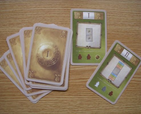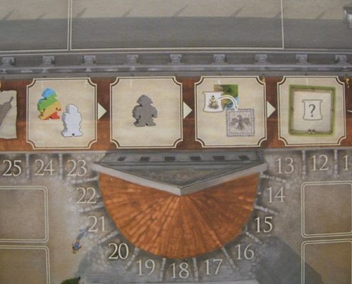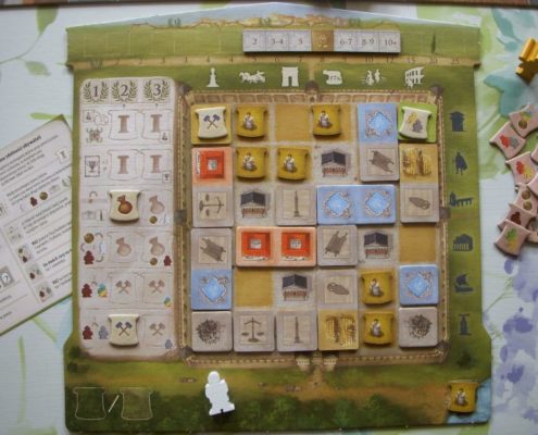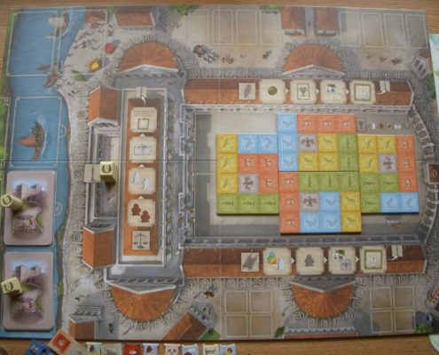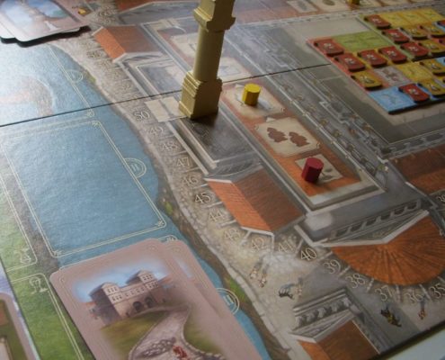Już sama waga i ilość elementów w pudełku daje nadzieję, że będziemy mogli cieszyć się grą dość złożoną i zaawansowaną. Pierwszym co rzuciło mi się w oczy była bardzo ładna oprawa graficzna gry. Wygląd planszy (Forum Trajana widziane z lotu ptaka), ilustracje kart ulicy, płytki mozaiki, plansze graczy – wszystko to zachęca do kontaktu z grą. Pierwsze zdziwienie: instrukcja gry na ostatniej stronie prezentuje krótki leksykon, w którym znajdziemy informacje o zabytkach Imperium Rzymskiego: tytułowym Forum Trajanum oraz budynkach przedstawionych na planszy, m.in. Bibliotece, Bazylice Ulpia, Halach Trajana. Czyżby ktoś próbował przemycić temat do gry Pana Felda? Rzeczywiście Forum Trajanum w oprawie graficznej ciekawie przedstawia temat gry i próbuje nadać jej klimat. Rozwieję od razu niepotrzebne nadzieje: rozgrywka jest już bardzo feldowska, klimat szybko ulatuje, a my skupiamy się tylko na zależnościach i powiązaniach między akcjami.