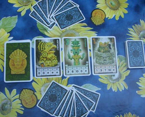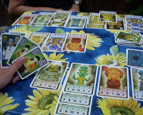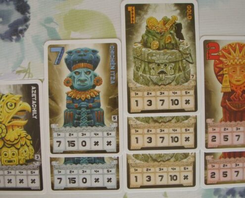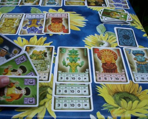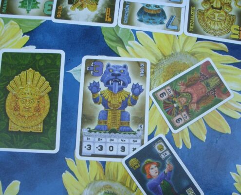 Chachapoya to węgierska karcianka osadzona w południowoamerykańskiej scenerii. Wcielamy się tu w archeologów i poszukiwaczy skarbów próbując tak wymanewrować przeciwników, by samemu pozostać z najcenniejszym łupem. Niewielkie pudełko, nieznane mi dotąd nazwisko autora, stosunkowo proste zasady, klimat rodem z filmów o Indianie Jonesie. Gra kusi piękną oprawą graficzną: dużymi kartami z ilustracjami skarbów, posążków kapiących złotem, figurek jakichś zapomnianych bóstw. W komplecie dostajemy też mniejsze karty poszukiwaczy przygód – równie interesująco zilustrowane. Sama rozgrywka doskonale wpasowuje się w klimat i temat gry; tu faktycznie czuć presję i rywalizację z przeciwnikami o to, by nie pozostać z niczym, by zdobyć te najdroższe łupy, nieistotne jak: przez oszustwo, blef, brawurę. Mechanicznie, moim zdaniem, ta gierka jest znakomita, dlatego właśnie poświęcam jej parę słów – jest i zabawna, i całkiem ciekawie zaprojektowana.