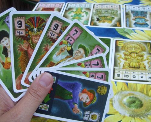 Emocje, interakcja, poczucie rywalizacji, nerwy przy końcu rozgrywki, zaskakujący często wynik końcowy. Przy tym dużo śmiechu. To dominujące wrażenia z moich rozgrywek w Chachapoya. Gra dobrze się skaluje, bo w zależności od liczby graczy do rozgrywki wchodzi inna liczba kart skarbów – nigdy nie wiemy jakie i w jakiej liczbie trafią do gry. Mi bardzo dobrze grało się w dwie osoby, mimo lekkiej modyfikacji zasad związanej z rozpatrywaniem liderów. Wydaje mi się, że partie wieloosobowe mogą się lekko dłużyć, do naszych partii wkradł się już leciutki chaos; dwuosobowe kończyły się zawsze w idealnym momencie, na pełnych emocjach. Jak w większości karcianek losowość związana z dociągiem kart poszukiwaczy może wpłynąć na wynik rozgrywki, jednak autor zaproponował tutaj naprawdę sporo opcji wspomagających los: karty tropicieli, skarb wojowników, którego zdobycie pozwala dobrać trzy nowe karty, użycie żetonu ukrytego skarbu. Dobrze rozwiązano też zagrożenie eliminacją z rozgrywki – choć czujemy tę presję podczas gry, to realnie wydarza się dopiero w ostatnie fazie gry, w moich rozgrywkach miała miejsce tylko w ostatnich rundach.