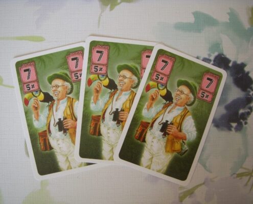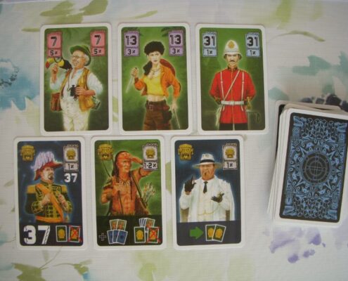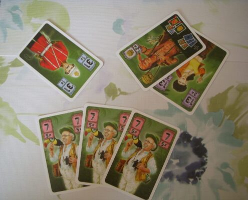 Często zdarza się, że gracze zwyczajnie nie chcą wygrać danej licytacji, bo przedmiotem aukcji są karty, które obniżą im wartość zestawu lub nawet wyeliminują z rozgrywki. Dlatego warto przyjrzeć się samej licytacji. Karty poszukiwaczy przygód posiadają pewną wartość liczbową, np. 7, 9, 11, czy 31 punktów oraz informację ile kart jednego typu gracz może zagrać naraz. Gracze zagrywają równocześnie wybraną liczbę kart tego samego typu, np. trzy karty każda o wartości 11 punktów, co daje im 33 punkty w licytacji. Nie można łączyć kart o różnej wartości punktowej. Gracz z najwyższą łączną liczbą punktów oczywiście wygrywa licytację i zdobywa obie karty skarbów, o które toczyła się walka. Lecz od tej zasady istnieje też szereg wyjątków i kart specjalnych – na szczęście. Tak więc wśród naszych dzielnych poszukiwaczy przygód znajdziemy tropicieli. To karty – jokery. Tropiciel dodany do zestawu kart zwykłych poszukiwaczy przybiera taką wartość punktową jak dany typ poszukiwacza. Dzięki takiemu zagraniu nie tylko zwiększamy łączną wartość punktów w licytacji, ale też dostajemy wybór – możemy zdecydować którą z dwóch kart skarbu na stole dołożymy do naszego tableau. Możemy wziąć tylko jedną z kart. To bardzo cenna cecha tropiciela, bo często zdarza się, że boimy się, co też za przekleństwo kryje zakryta karta skarbu lub też mamy już zebrane maksymalnie punktujące zestawy i każda nowa karta tylko zmniejszy nam wartość trofeów. Gracz może też zagrać dwie karty tropicieli, o ile ma akurat takie na ręku – rozbija to całą licytację w tej rundzie, karty skarbów wędrują na spód talii, efekty kart innych graczy nie są rozpatrywane, a sam autor tej rozróby choć nie zdobywa żadnego skarbu, to dobiera trzy nowe karty poszukiwaczy na rękę.