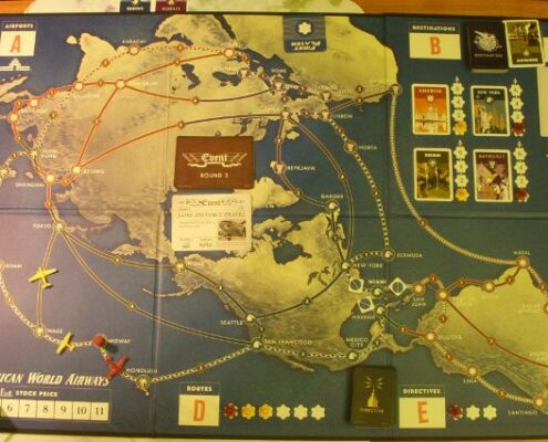 Krótko o zasadach. Gra toczy się przez siedem rund. Każda runda składa się z czterech faz. W fazie wydarzeń odsłaniamy kartę zdarzenia. Do każdej rozgrywki wchodzi siedem losowo dobranych kart zdarzeń, uszeregowanych zgodnie z kolejnością rund, przedstawiających historyczne tło zachodzących wydarzeń, pokrywając okres od lat dwudziestych do sześćdziesiątych XX wieku. Gracze realizują zdarzenie wskazane na karcie oraz dostosowują cenę akcji Pan Am na torze planszy zgodnie ze wskazaniem odkrytej karty. W drugiej fazie rundy, gracze zgodnie z kolejnością rozstawiają swoich inżynierów na polach akcji. W grze dwuosobowej każdy dysponuje pięcioma pionami inżynierów, w trzyosobowej czterema, w maksymalnym składzie trzema. Na planszy odnajdziemy pięć obszarów akcji: obszar lotnisk, destynacji, samolotów, tras lotniczych oraz kart wskazówek. W tej fazie gracze nie realizują jeszcze akcji, tylko przypisują do nich piony, nakreślając tym samym plan działań na daną rundę. Większość obszarów akcji ukazuje tory licytacji. Gracz umieszczając pion inżyniera na polu danego toru określa jednocześnie cenę jaką będzie musiał zapłacić przy realizacji akcji. Gracz, który chce wykonać tę samą akcję musi przelicytować przeciwnika umieszczając inżyniera swego koloru na polu z wyższą ceną. Przelicytowany inżynier wraca do właściciela i może być znów użyty.