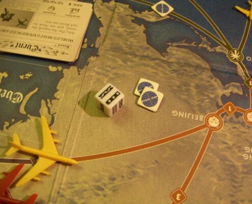 Niestety gracze muszą też walczyć z losem. Los występuje w postaci kostki narzucającej ekspansję linii Pan Am – lecz ten jest przewidywalny. Los potrafi znacząco wpłynąć na cenę akcji Pan Am-u, poprzez odkrywane kolejno karty wydarzeń. Ten zabieg odzwierciedla jednak sytuację historyczną i niepewność działania na tym pionierskim rynku – ja nie mam z tym problemu. Zastanawiają mnie jednak karty wskazówek, dobierane przez graczy zupełnie losowo, w tym szczególnie karty pozwalające dobrać za darmo akcje Pan Am na końcu gry. W niektórych moich rozgrywkach to właśnie te karty przesądzały o zwycięstwie. Ogólnie, różnice między graczami nie są w tej grze zbyt duże. To przewaga zazwyczaj jednego do trzech udziałów. Szczęście w dociągu może zatem przesądzić o wygranej.
