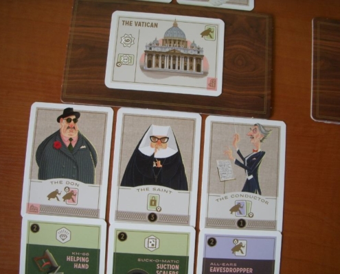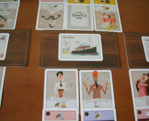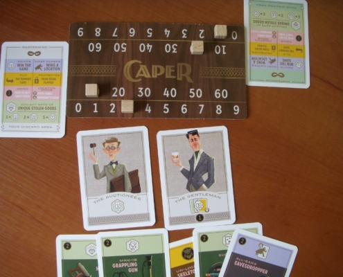 Ta gra ma w sobie sporo subtelności. Caper na pewno przyciąga oko charakternymi grafikami postaci i zabawnymi pomysłami na karty złodziejskiego sprzętu. Opisy ikonografii zastosowanej w grze zebrano nawet w oddzielny katalog imitujący broszurę reklamową specjalistycznego sklepu dla włamywaczy. Najbardziej bawi jednak sam sposób rozgrywki – zabawa w przeciąganie liny przy każdej z trzech lokacji. Gracze na bieżąco widzą jaką kartę wykłada przeciwnik, zliczają symbole złodziejaszków potrzebne do dokonania skutecznego włamania, na gorąco reagują na poczynania każdej z trzech drużyn rywala. Ograniczona liczba kart złodziei i sprzętu nie pozwala na doskonałe przygotowanie każdej z trzech ekip. Gracze muszą wybrać, która lokacja jest dla nich cenniejsza, gdzie mogą odpuścić już rywalizację, a gdzie są jeszcze w stanie zawalczyć o przewagę. Gra jest dzięki temu dynamiczna i wymaga sporej decyzyjności. Caper to świetny przykład szybkiej i prostej, ale jednocześnie bardzo sprytnej i nieoczywistej karcianki. Rozgrywki są różnorodne, bo zmieniające się w każdej partii lokacje często opatrzone są dodatkowymi modyfikatorami wpływającymi na grę. Główny silnik gry, czyli draft – wymienianie się całą ręką kart w każdej rundzie, po każdej zagranej karcie – znakomicie oddaje tę złodziejską wymianę ciosów, rywalizację drużyn w jak najlepszym przygotowaniu do wielkiego skoku. Caper jest grą z mocnym klimatem. Tu faktycznie czujemy się jak banda opryszków, wyszukujemy na rynku najlepszy sprzęt, dobieramy przebrania i przykrywki, łączymy ze sobą sprzęgające się karty, by uzyskać jak najsilniejsze kombo. Fajne jest również to, że w każdym z trzech miast okraść możemy słynne atrakcje turystyczne, a sposób i charakter rozgrywki (a także stopień trudności) dostosowuje się do stylu danego miejsca. W artystycznym, snobistycznym Paryżu polować będziemy głównie na unikalne dzieła sztuki, Rzym zaskoczy nas mnogością złodziejaszków i opcją przekrętów, a w Londynie skupimy się na zarządzaniu finansami.