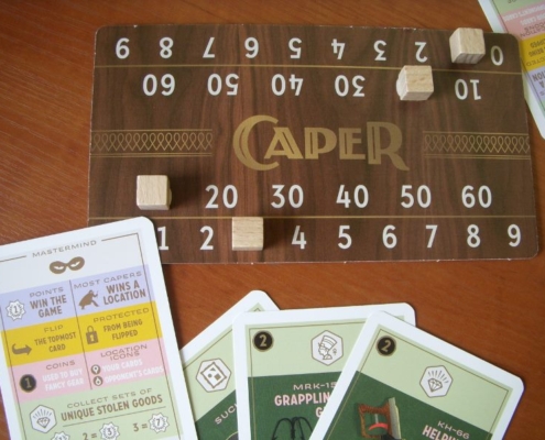 Caper jest dobrze przemyślaną i ciekawie zaprojektowaną karcianką bazującą na mechanice draftu. To świetny pojedynek dwóch graczy, doskonale oddający temat planowania skoku stulecia na najsłynniejsze zabytki europejskich metropolii. Bardzo atrakcyjne grafiki i sporo delikatnego humoru na kartach tylko zwiększają przyjemność z bawienia się tą grą. Podoba mi się dynamika rozgrywek, próby zdobycia kontroli nad lokacją i poczucie przeciągania liny, żywa interakcja i częste zaskoczenia związane z wynikiem rozgrywek, bo warto walczyć tu do końca korzystając z wpływających na siebie zdolności kart. W mojej opinii to gierka całkiem nieprzeciętna pod względem pomysłu na rozgrywkę. Polecam ją Waszej uwadze, z dwoma wszak zastrzeżeniami.
