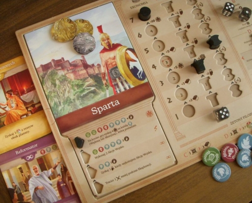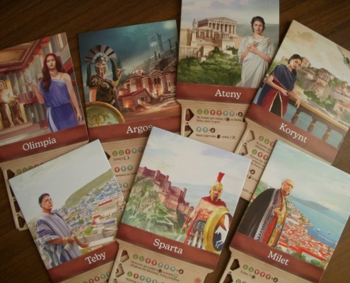 Mnie zaskoczyła bardzo pozytywnie. Do pierwszej rozgrywki podchodziłam nieufnie, bo nie przekonały mnie wszechobecne tory rozwoju i spodziewałam się rozgrywki żmudnej i bez polotu. Bardzo się pomyliłam. Szybciutko wciągnęłam się w kolejne rozgrywki i wypróbowywanie mocy kolejnych greckich miast-państw. Warto jednak zaznaczyć, że Khora jest typowym przedstawicielem gatunku eurogier i jakiegoś szczególnego zanurzenia w klimacie starożytnej Grecji raczej tu nie doświadczycie. Temat wspierają jednak ilustracje oraz opisy historyczne na rewersach kafli miast oraz te w instrukcji; duży plus zatem dla autorów za choćby tę próbę wprowadzenia ciekawego tematu do gry. Dla osób ceniących żywą interakcję w swoich rozgrywkach, ta jej dawka obecna w Khorze może nie być wystarczająca (to głównie wyścig na torach, zdobywanie osiągnięć, podbieranie żetonów wiedzy). W zupełnie pierwszym kontakcie z grą i instrukcją lekkie zagubienie wprowadzała ta mniej intuicyjna ikonografia i nazewnictwo (ikony sów na oznaczenie toru podatków, żetony wiedzy zdobywane akcją wojska), lecz to właściwie wyczerpuje listę zarzutów, jakie postawiłabym tej grze.