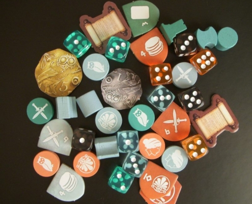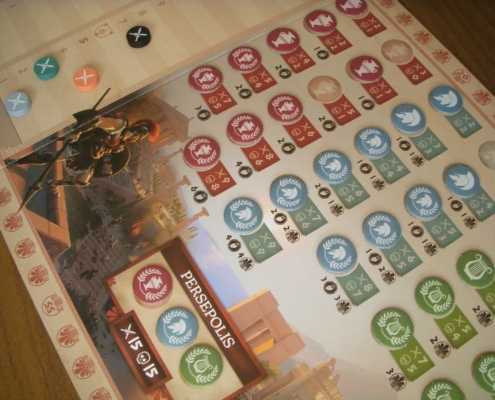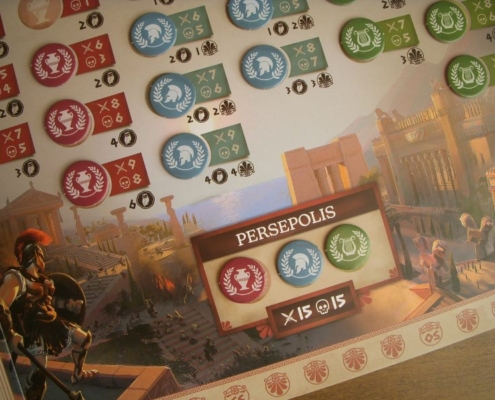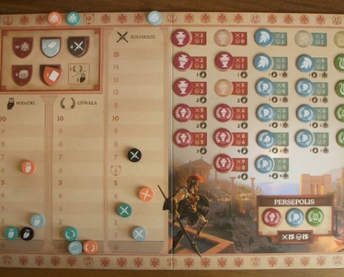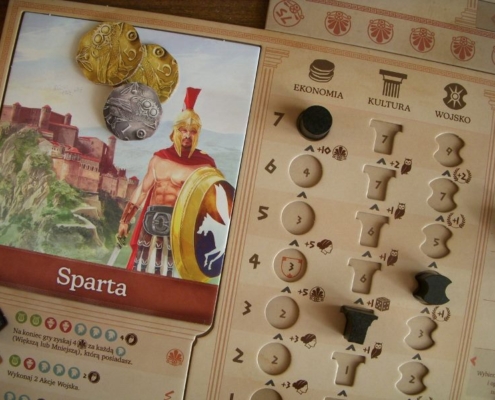 To właśnie takie zestawienie silnych stron miasta ze zdolnościami kart, w połączeniu ze sporym ograniczeniem wyboru akcji w rundzie – zaledwie dwóch z siedmiu! – każe porządnie się wysilić podczas rozgrywki w Khorę. Nie damy rady zrobić wszystkiego, co zatem wybrać? Co jakiś czas wypadałoby też zerknąć na wybory przeciwników, gdyż dużym ułatwieniem w grze są nagrody pozyskane z osiągnięć, a te przyznawane są graczowi, który jako pierwszy osiągnął wskazany na planszach poziom rozwoju wybranych torów. Prosto rozwiązano pozyskiwanie żetonów wiedzy (kolorowych żetonów amfor, hełmów i lir): gracz decydując się na przeprowadzenie akcji wojska uprawniony jest do pozyskania żetonu leżącego nie dalej niż wskazuje jego aktualna liczba żołnierzy. Musi jednocześnie obniżyć się na torze żołnierzy o wskazaną przy zabranym żetonie liczbę stopni. Czyszczenie tej tablicy żetonów zajmującej prawą stronę planszy oraz ciągłe obniżanie i podnoszenie się na torze żołnierzy to zajmująca część gry. Żetony wiedzy potrzebne są bowiem do odblokowywania kolejnych rozwinięć kafla miasta i zagrywania kart polityki; zaś te opatrzone laurem służą do podbicia liczby punktów zwycięstwa na końcu gry. Warto o nie się bić i podbierać je przeciwnikom.