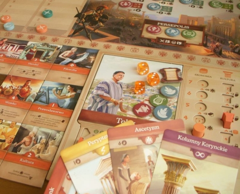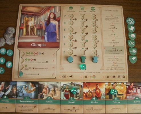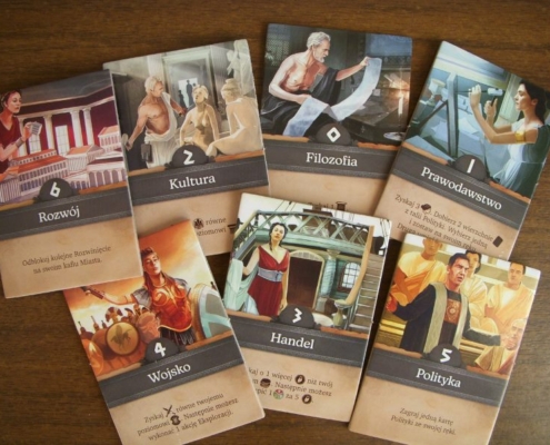 Tym, co mnie najbardziej kusi i ciągnie do kolejnych rozgrywek jest jednak specjalizacja i zmienność, którą niesie zestawienie umiejętności poszczególnych kafli polis oraz, dobranych z użyciem draftu, kart polityki. Przed rozgrywką gracz dobiera sobie jeden z siedmiu kafli miasta, któremu chciałby przewodzić. Umieszcza go w wyżłobionym miejscu na swej planszy gracza, od razu zaznaczając odblokowanie pierwszej zdolności przypisanej temu miastu. Już na samym początku różnicujemy się od przeciwników. Co innego staje się naszym atutem. Każde miasto posiada aż cztery rozwinięcia. Odblokowanie ich (z pomocą akcji rozwoju) pozwala nabyć coraz to silniejsze moce: błyskawiczne, na całą grę lub przynoszące punkty za spełnienie danych warunków na końcu partii. Sporym grzechem byłoby nie skorzystanie z tych silnych zdolności; wybrane miasto prowadzi nas przez rozgrywkę zachęcając do dopasowania strategii pod jego atuty. Smaczku dodaje fakt, że każdy rozpoczyna grę z pięcioma kartami polityki (a dzięki akcji prawodawstwa może pozyskiwać kolejne). Karty te, o ile zostaną zagrane w akcji polityki, podobnie jak rozwinięcia miast będą zapewniać graczowi określone korzyści. Rozgrywka rozpoczyna się już w trakcie przygotowywania gry, kiedy to draftujemy potrzebne karty, próbując wymyślić zarys strategii konkretnie pod nie oraz zaplanować kolejność ich zagrywania.