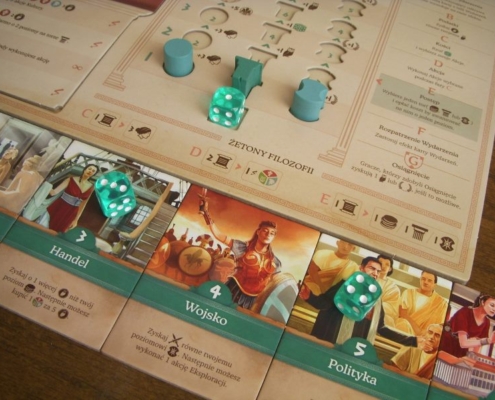 Powiedziałabym, że Khora to gra stylowa. Czerpie z klasyki. Raz, obiera sobie za temat świat starożytny; dwa, wykorzystuje ograny już pomysł torów rozwoju i postępu na nich. Celem graczy jest jak największy rozkwit prowadzonego miasta, poprzez rozwój ekonomii, kultury i wojska. Spójrzcie jak tu wszystko się łączy: postęp na torze ekonomii własnego miasta-państwa wymusza postęp na torach punktów zwycięstwa oraz obywateli, ten zaś impregnuje nas na ewentualność pechowych rzutów kośćmi. Postęp na torze kultury, poza tym że odblokowuje trzecią akcję w rundzie, zwiększa też wpływy z podatków, nagradzając nas dopływem drachm w każdej nowej rundzie. Postęp na torze wojska, zwiększając liczbę żołnierzy, pozwala coraz to śmielej eksplorować i zdobywać coraz cenniejsze żetony amfor, hełmów i lir. Te, przemnożone przez punkty chwały (zdobyte, a jakże, dzięki postępowi na torze wojska), przyniosą znaczący zastrzyk punktów zwycięstwa na końcu gry.