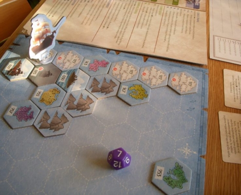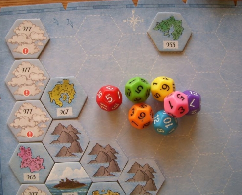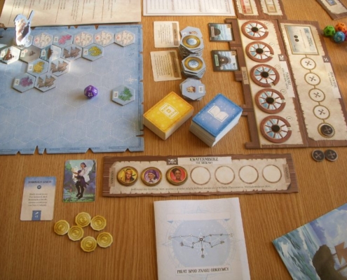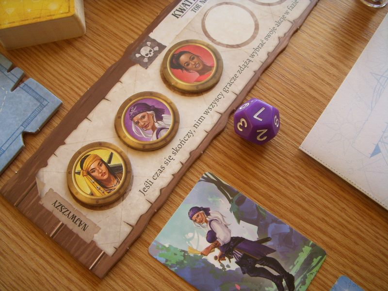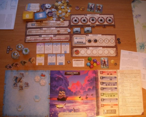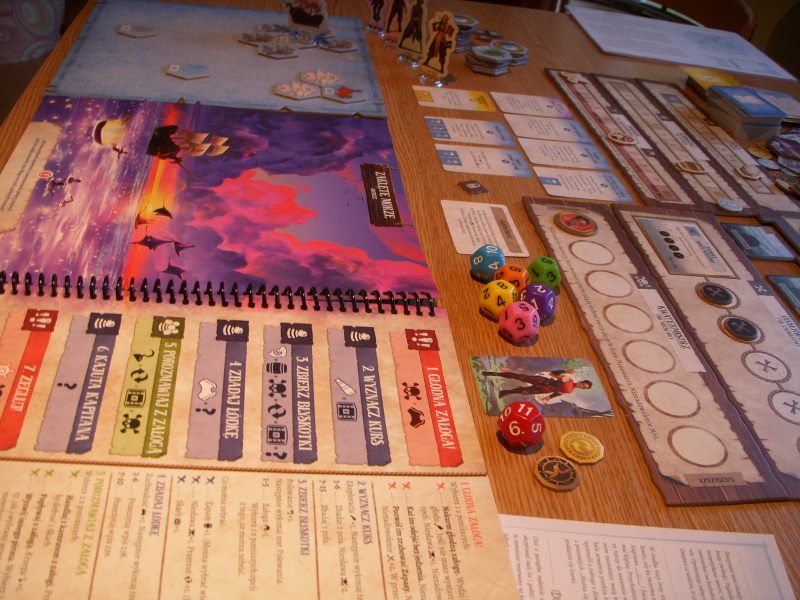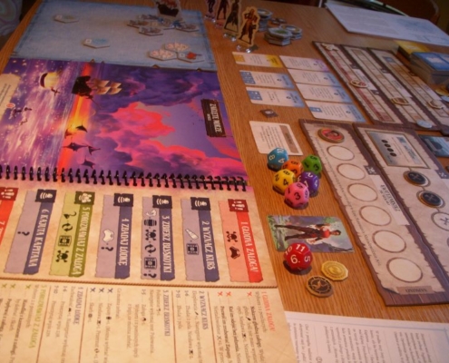 Przerobiłam dotąd trzy z pięciu scenariuszy Zapomnianych Mórz: regulaminowy pierwszy (wprowadzający w świat gry), Serce wiedźmy oraz ostatni z nich, pt.: Wspaniałości natury. Każda rozgrywka wymaga około czterech – pięciu godzin na przejście całej historii. Na szczęście istnieje tu możliwość przerwania gry po ukończeniu pierwszej części scenariusza i zapisania stanu rozgrywki na późniejsze posiedzenia, ale i tak uważam, że gra zyskałaby wiele na skróceniu tych historii. Toczenie nieustannych bitew, konieczność ciągłego rzucania kostkami, wczytywanie się w kolejne bajdurzenia kapitana w jego kajucie w pewnym momencie stają się banalne i powtarzalne. Sama wolałabym dostać tu na przykład dziesięć scenariuszy mieszczących się w połowie lub nawet jednej trzeciej tego czasu.