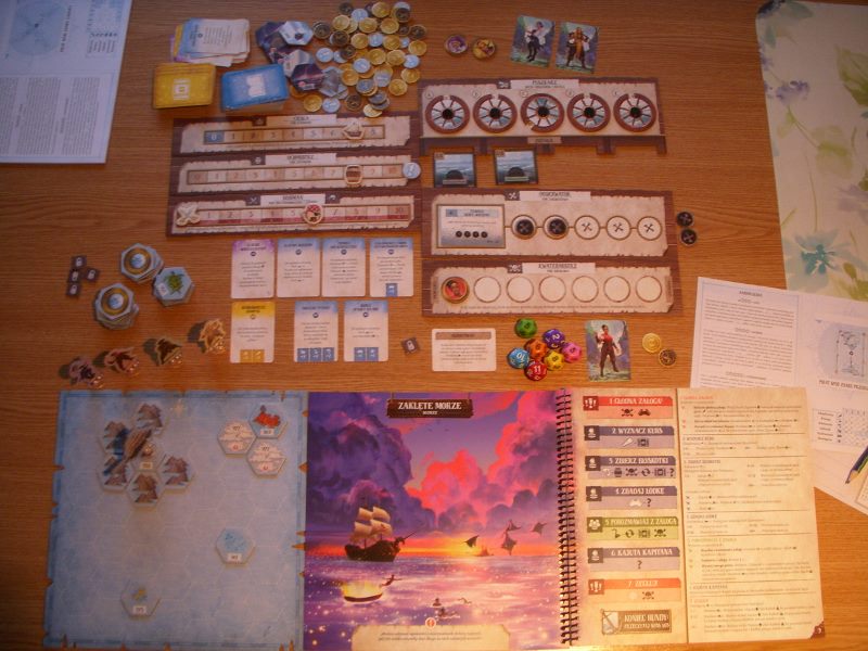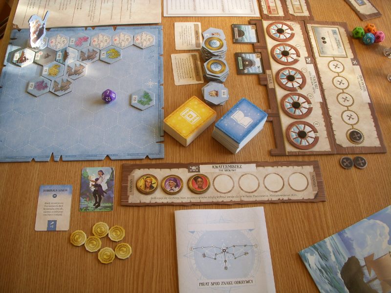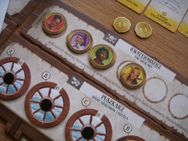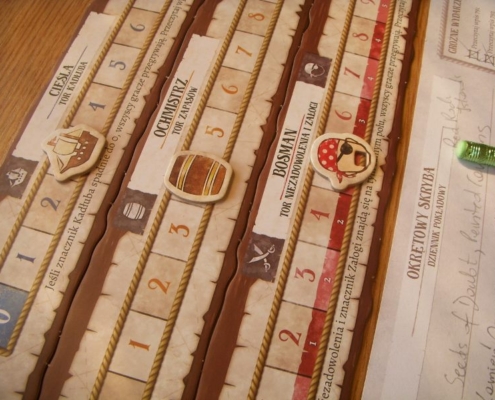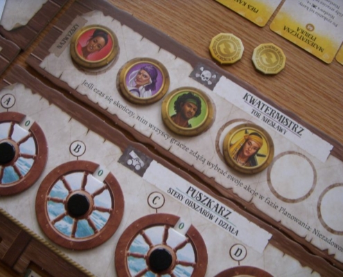 Kolejnym fajnym rozwiązaniem tej gry jest zaangażowanie wszystkich grających w opiekę nad statkiem. Każdy z graczy pełni bowiem pewną funkcję: bosmana, ochmistrza, cieśli, puszkarza, kwatermistrza, czy obserwatora i sprawuje pieczę nad którąś z plansz, czy też torów, na których przesuwa odpowiednie znaczniki opisujące parametry statku i załogi. To dobre rozwiązanie włączające wszystkich do obsługi gry, i przy tym bardzo klimatyczne.