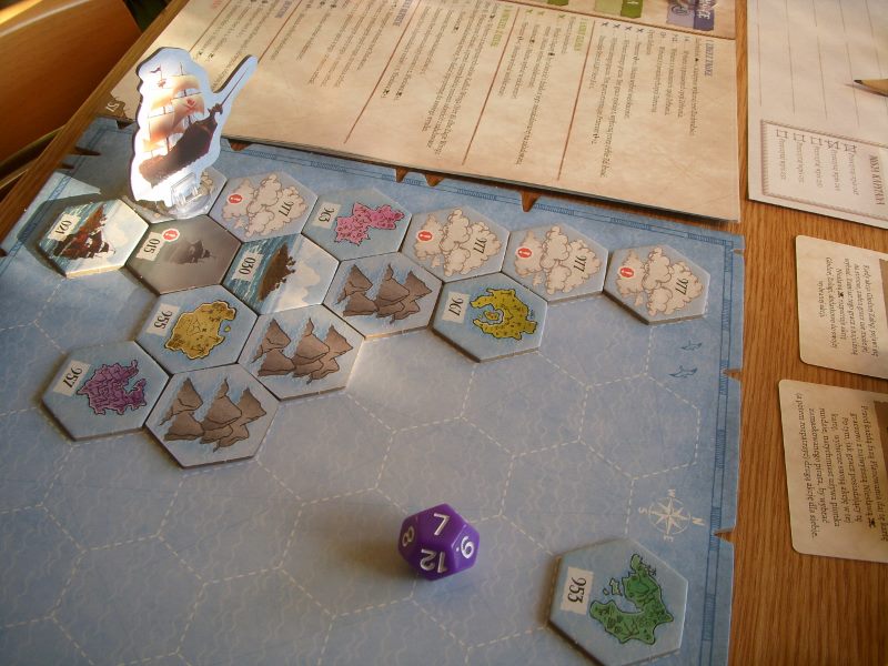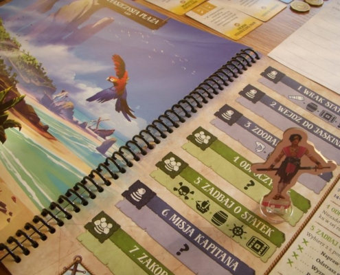 Same scenariusze zaś… hmm, początkowo wydają się ekscytujące, mocno nakierowane na przygodę i odkrywanie nowych kart księgi i nowych pól mapy. Tyle, że w pewnym momencie znużenia rozgrywką wszystkie zdają się już takie same. Mi osobiście zabrakło w nich jakiegoś powiewu świeżości, odmiany, czegoś niesztampowego. Skoro są piraci musi być i rum (tu akurat nie mam nic przeciwko) i papuga (też w sumie lubię) i kuternoga (ee…) i szpecąca blizna na twarzy (stanowczo nie lubię) i niewybredne szanty (nie wiem, co sądzę). Dla mnie te historie są czasem zbyt dosłowne, nie pozostawiające pola dla wyobraźni. Choć wciąż doceniam humor tych opowieści. To już czepialstwo, wiem, bo czego w sumie oczekiwać po grze o piratach.