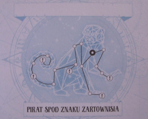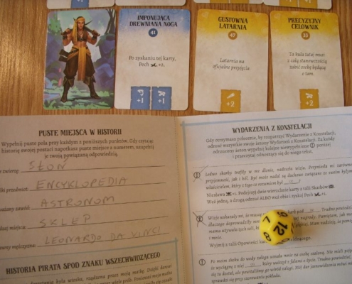 Bardzo podoba mi się ten element gry: arkusze konstelacji oraz indywidualne dążenie graczy do rozwoju własnej postaci. Wprowadza pewne napięcie do rozgrywek, każe wyważyć każdą sytuację, wiedzieć kiedy warto jeszcze zaryzykować, a kiedy działać posłusznie w grupie. Zdecydowanie wolę semi-kooperację od pełnej kooperacji. Jest wredniejsza, jest podstępna, jest nieoczywista. Ale to nie wszystko. Arkusz gracza to także karta pełna humoru. Na niej gracze tworzyć będą historię i opis swojej postaci, zmuszeni przed rozgrywką do wpisania pięciu dość losowych słów w odpowiednie kratki, którymi następnie uzupełniać będą teksty kolejnych etapów rozwoju swojej postaci. To świetny pomysł, zabawny, czasem prowadzący do absurdalnych zbitek słów, czy skojarzeń i pozwalający jeśli nie zżyć się, to chociaż spróbować wczuć się w meandry losu prowadzonej postaci. Choć w losy pirata spod znaku choroby morskiej wczuwać się nie polecam.