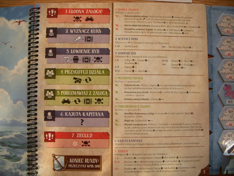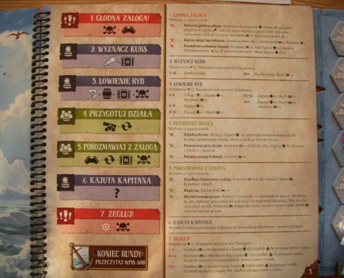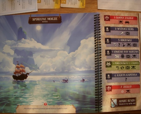 Najpiękniejszym elementem gry jest jednak Księga obszarów, na której stronach toczyć będą się kolejne rundy gry. Na każdej stronie znajdziemy barwną, przecudnej urody ilustrację przedstawiającą obszar, na którym znajdują się aktualnie piraci oraz zestaw akcji możliwych do przeprowadzenia w tym obszarze. Szybko, bez zbędnego wczytywania się w działanie poszczególnych akcji, lecz zgodnie z piracką hierarchią niesławy, gracze umieszczają pionek swej postaci na którejś z możliwych akcji. Bez ociągania się, by zdążyć przed odmierzającym czas stoperem. To faza planowania. Z konieczności jest to planowanie na chybcika, pirackie, instynktowne. To część zabawy. Teraz dopiero gracze rozpatrywać będą kolejne akcje zgodnie z instrukcjami księgi, najczęściej zdobywając kolejne zdolności rozwijające postać i testując je albo czytając wskazany wpis w aplikacji.