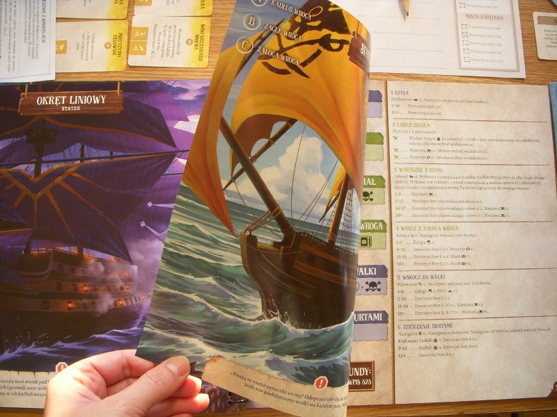 Poza humorem wiele tu też pirackich historii. Korzystając z akcji żeglugi gracze przesuwać będą statek na kolejne pole mapy, a każdy nowy żeton obszaru pozwoli przeczytać nową opowieść z życia piratów, nie zawsze bezpośrednio związaną z realizowaną misją. Podobne możliwości prezentować będą wybrane lokacje księgi obszarów. To bardzo bogate opisy pirackiego życia. Cała fabuła gry jest mocno zagnieżdżona w pirackim klimacie, upakowana aż po kokardki korsarskim słownictwem, a na niekończące się przygody pirackiej braci składać się będą: niezliczone bitwy z innymi statkami, bitwy z potworami, bitwy z pogodą oraz odkrywanie nowych lądów i wysp. Tu pojawi się mój chyba największy zarzut do tej gry, a mianowicie: te historie są za długie.