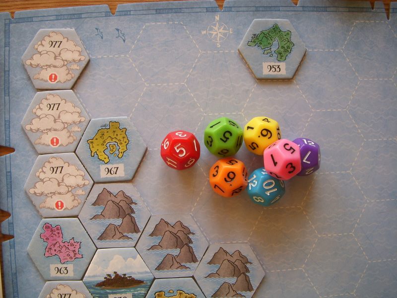 Do zasobów pirata należy też dwunastościenna kostka w kolorze jego postaci, będąca w użyciu bardzo często, służąca do testowania zdolności potrzebnych do wykonania większości akcji. Każdy rozpoczyna też grę z jedną kartą skarbu, zaś w trakcie gry może zdobywać kolejne do limitu czterech. Skarby służą zazwyczaj jakąś pomocą, zwiększając talenty gracza lub umożliwiając przerzuty kości. Do rozgrywek wchodzą też karty opowieści – te już bez limitów – pobierane z równie pokaźnej talii. To będą przedmioty lub istoty bezpośrednio już związane z daną historią, często zabawne lub absurdalne. W ogóle dużo w tej grze delikatnego, czasem absurdalnego, humoru.