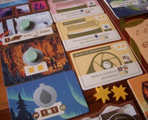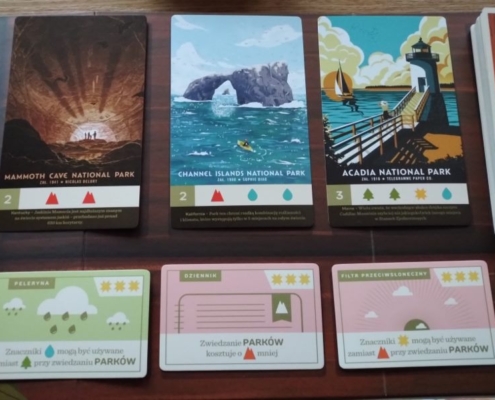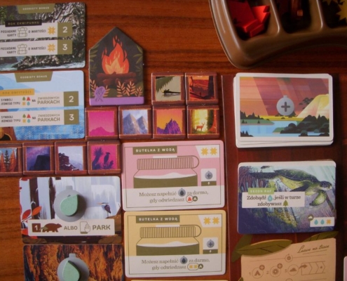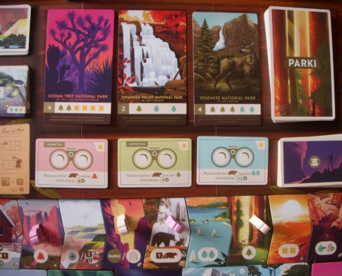 Parki to gra lekka, łatwa i przyjemna. Co może wadzić, to fakt, że jest jednak nieco zbyt lekka w rozgrywce. Wymagania tylko jednej karty celu, którą dostajemy na początku partii, dość łatwo jest spełnić i przydałoby się tu większe wyzwanie, by zapewnić większą regrywalność. Jednak w żadnej mierze nie jest to gra banalna, czy nijaka. Sama chciałam tak sądzić w pierwszej rozgrywce, lecz okazało się, że drobne zależności, typu: wykorzystanie i przejęcie aparatu do cykania fotek, walka o żeton pierwszeństwa, wykorzystanie ogniska do zajęcia blokowanego miejsca akcji, poświęcanie ruchu na zdobywanie dżokerów lub kart ekwipunku, czy manierek, a nawet tempo przesuwania turystów na trasie – wszystkie one – składają się na całkiem atrakcyjną pajęczynkę decyzji. Teraz uważam, że Parki to idealny produkt w kategorii gier rodzinnych.