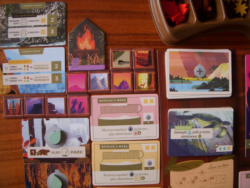 Rozgrywka ma swoją dynamikę narzucaną przez zmienne rozłożenie kafli szlaku, inny wzorzec pogodowy w każdej z pór roku, a przede wszystkim przez pionki innych graczy co i rusz blokujące niezbędne nam pola akcji. Fakt, że poruszamy się dwoma pionkami turystów pozwala na ciekawe planowanie kolejności wykonywania akcji i blokowanie innych graczy. Fakt, iż każdorazowe przejście szlaku jest swoistym wyścigiem o zwiedzenie lub choćby zarezerwowanie potrzebnej karty parku dodaje trochę napięcia do rozgrywek – tak w sam raz na grę familijną. Ostatni z pionków, który samotnie pozostanie na szlaku, po tym jak inni gracze doprowadzili już swoich turystów do mety, musi natychmiast kończyć swą przygodę i stawić się na końcu szlaku bez ociągania. To pozwala trochę przykrócić zapędy maruderów chcących odwiedzać każdą lokację krok po kroczku. Szlak wydłuża się o jeden kafel co rundę i zmienia rozłożenie kafli akcji. To, oraz fakt, że między turami gracze nie mogą posiadać więcej niż 12 znaczników zasobów, każe planować wszystko na bieżąco, wykorzystywać okazje od razu, nie ciułając zasobów na zaś. Rozgrywka w Parki trzyma dobre tempo i zapewnia dobrą porcję planowania na nie więcej niż godzinkę zabawy. Dobrze sprawia się na dwie osoby, natomiast rozgrywka wieloosobowa może być nieco bardziej frustrująca z uwagi na blokowanie potrzebnych lokacji szlaku. Co ciekawe, niegłupi jest też wariant solo tej gry. Ten rozgrywamy przeciw strażnikom parku, którzy zbierając z lokacji znaczniki słońca lub wody dokładają je do swojej karty – i w zależności od liczby i rodzaju zebranych znaczników wywołują negatywny efekt dla gracza. Gracz poza próbą osiągnięcia normalnych celów ma zatem na głowie próby zapobiegania odpaleniu negatywnych skutków ruchu strażników.