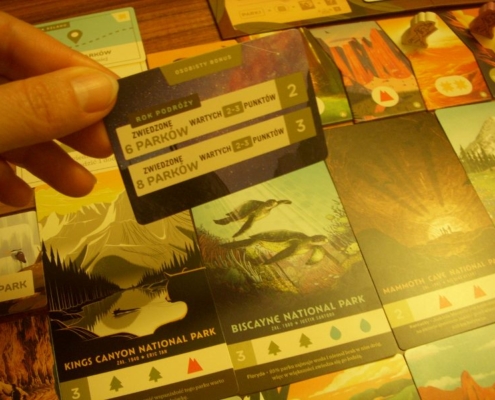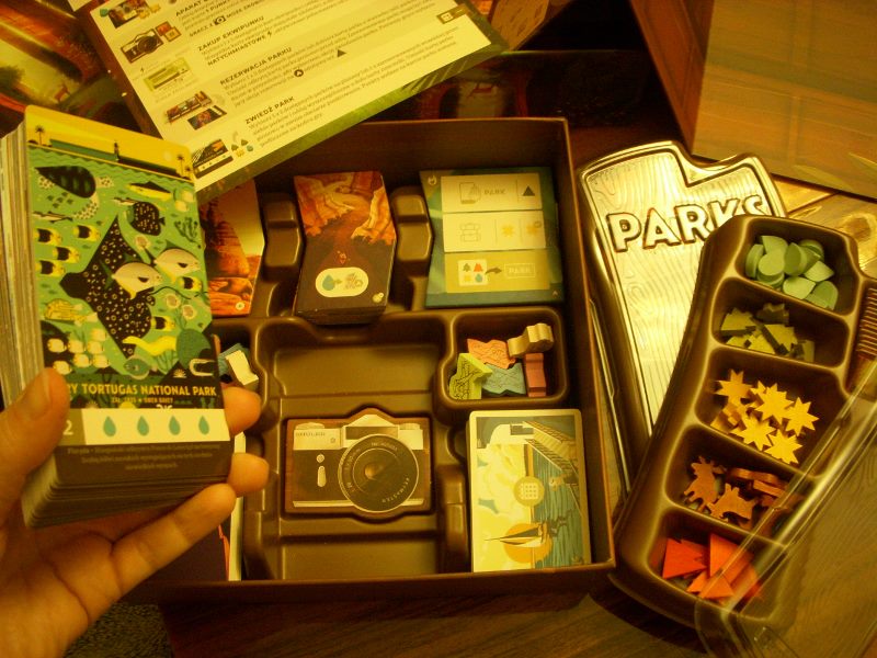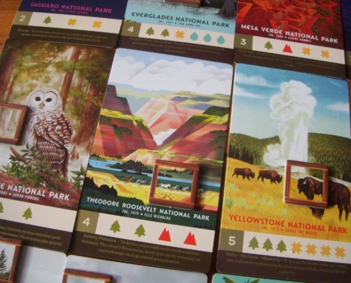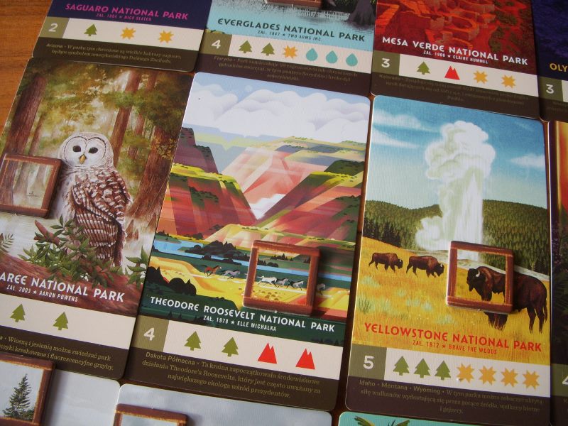 Nie można oczywiście ukrywać, że tym co stanowi o jej atrakcyjności jest oprawa graficzna. Wykorzystanie grafik plakatów ukazujących piękno amerykańskich parków narodowych sprawia, że trudno byłoby tę grę przeoczyć. Ilustracje kart są w mojej opinii bezkonkurencyjne; nie znam gry, która mogłaby stanąć w szranki z Parkami. Zachwyca też staranność wykonania tej gry: nawet ujęcia kafelków zdjęć są fragmentami grafik kart poszczególnych parków narodowych. Do tego dodano świetną wypraskę z miejscem na każdy komponent gry i taki sposób ich ułożenia, by nic się w pudełku nie przemieszczało podczas transportu. Jedyne, co rzeczywiście przeraża, to cena jaką musimy zapłacić za ten bądź co bądź familijny produkt.
