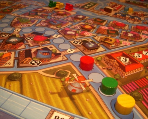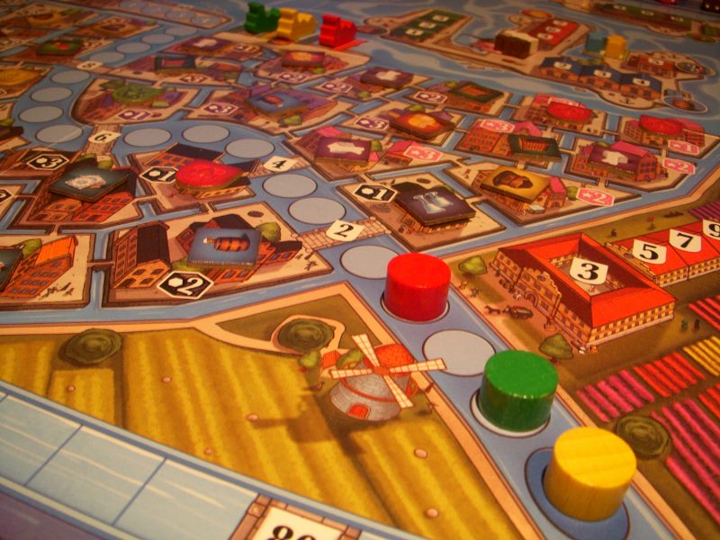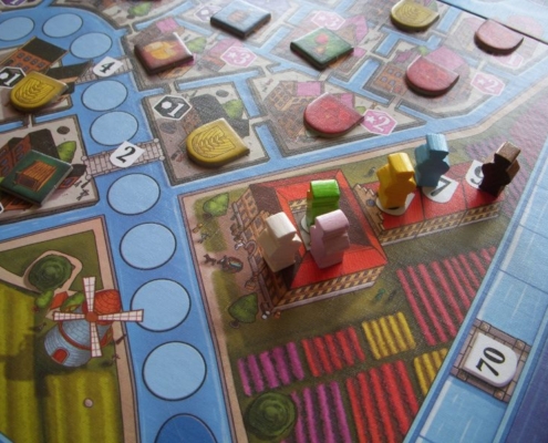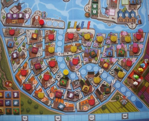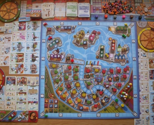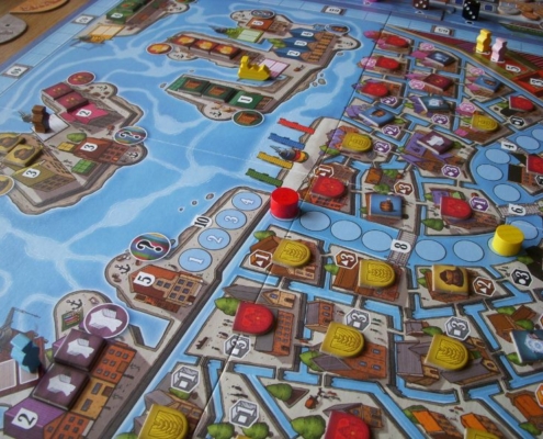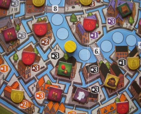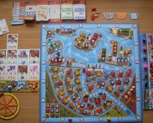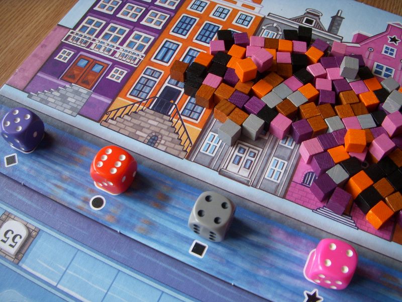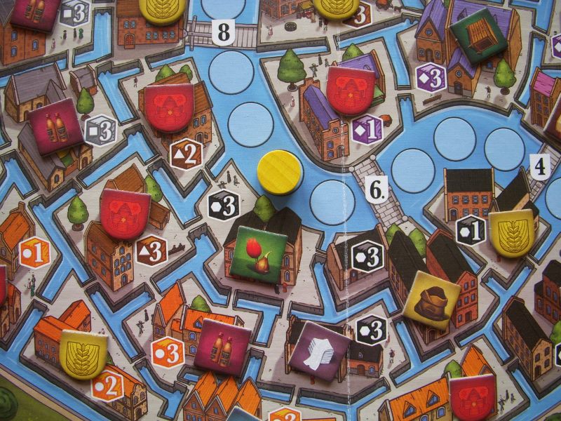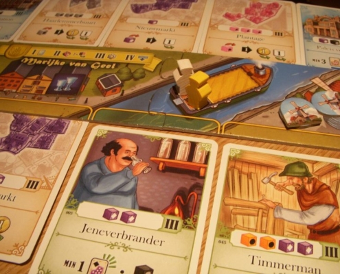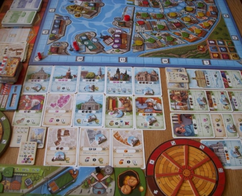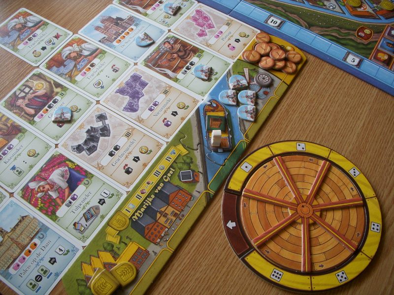 To niebywałe jeśli chodzi o gry tego autora. Już patrząc na planszę, nie wierzyłam własnym oczom. Jesteśmy w Amsterdamie zatem widzimy system kanałów rozdzielających poszczególne dystrykty i dzielnice miasta. Gdzieś na peryferiach zauważymy pola tulipanów i wiatraki. Z planszy zbierzemy i przetransportujemy żetony, na których przedstawiono krąg sera, czy cebulkę tulipana. Wciąż wszystko się zgadza, nie ma dysonansu. Zaiste niebywałe! Co więcej, zebrany towar mamy prawo załadować na statek tylko wówczas, gdy ten znajduje się w doku z żurawiem. Tam również na nasz pokład może wskoczyć pracownik zmierzający do pracy w innym, odpowiadającym mu barwą, doku. I na dzień dobry wręczy nam opłatę za przejazd. Jakże to intuicyjne i logiczne! Jakże niespotykane w grach Stefana Felda. To nie wszystko, miejsce akcji obrano tu wyjątkowo trafnie (i złośliwie) – przez całą rozgrywkę widzimy, ze znajdujemy się w prawdziwym kanale: gra nas ogranicza i nigdy nie pozwala wypłynąć na szerokie wody: tu może być tylko ciasno lub ciaśniej. Tutaj naprawdę czujemy, że jesteśmy w Holandii!