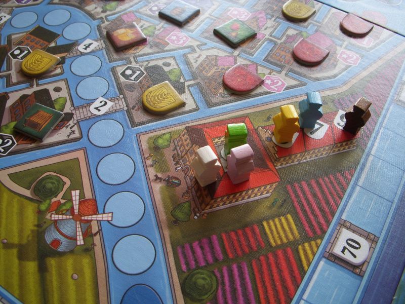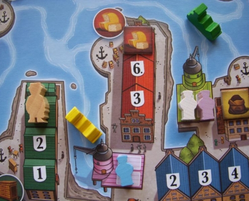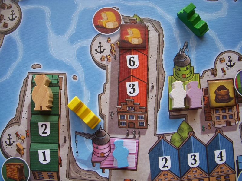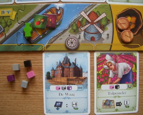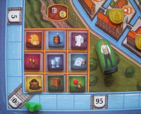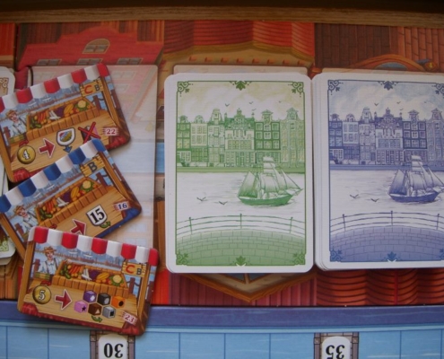 Poza transportem dóbr nasz statek może też zabrać na pokład kolorowych pracowników, którzy pragną dostać się do doku w swoim kolorze (jako żywo przypomina to pływanie wte i wewte znane z Wyroczni delfickiej). Co najważniejsze, pracownicy płacą nam za przejazd! A my z chęcią przygarniemy pieniądze, w każdej ilości. Nawet w ilości równej jeden. Wciąż możemy bowiem wymieniać pieniądze na punkty zwycięstwa – w Amsterdamie dzieje się to dzięki kaflom rynku. Co rundę odsłaniany jest nowy kafel oferujący jednokrotną wymianę wskazanej gotówki na punkty, a czasem nagradzający taką wymianę kosteczką zasobu lub ruchem na torze kolejności. Czy wspominałam już jak cenne są w tej grze kosteczki zasobów? Cieszymy się z każdej ich liczby. Nawet z liczby równej jeden. Skoro tak, pojawia się nowa bezcenna opcja: możliwość przechowania jednej kosteczki pomiędzy rundami.