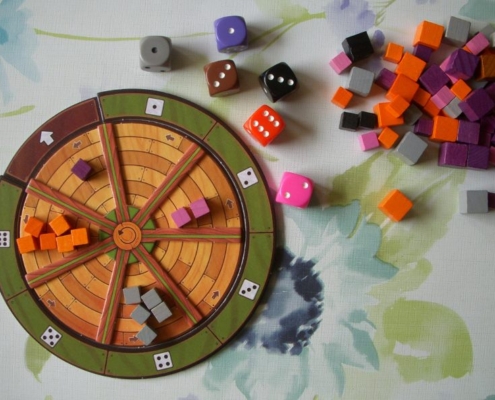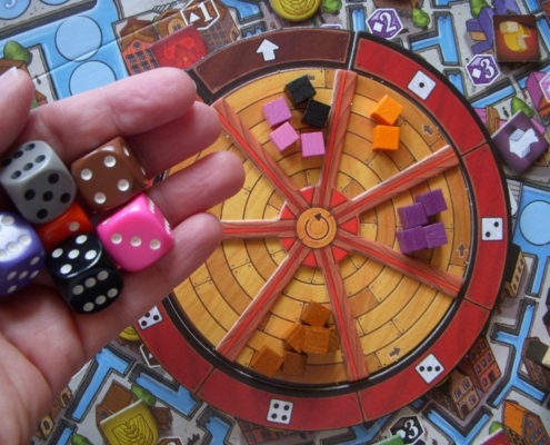 Na koniec tej przydługiej recenzji (lecz przecież nie tak długiej jak sama rozgrywka w Amsterdam) dwa zdania na temat trybu solo. Mi spodobał się bardzo, bo jest prosty i intuicyjny w obsłudze, no i oczywiście najkrótszy w rozgrywce. Gramy przeciw Tomowi, którego akcje określane są przez ten sam rzut kośćmi, na którym my opierać będziemy własny plan gry. Najpierw rozpatrujemy poczynania Toma. Za każdą wyrzuconą jedynkę Tom przesunie się na torze kolejności. Za każdą wyrzuconą szóstkę: przejmie dzielnicę miasta. Pozyskany towar sprzeda na czarnym rynku w miarę wolnego miejsca lub umieści od razu w docelowym magazynie zbierając za to punkty. Za pozyskane pieniądze zawsze spróbuje skorzystać z nagrody kafla rynku. Za każdą trójkę kości z tym samym wynikiem sprzątnie nam sprzed nosa określonego pasażera i dostarczy go natychmiast za punkty zwycięstwa. Tom działa szybko, podstępnie i losowo. W tym trybie losowość odczuwamy chyba najbardziej – mimo to taka rozgrywka staje się bardzo ciekawą łamigłówką.
