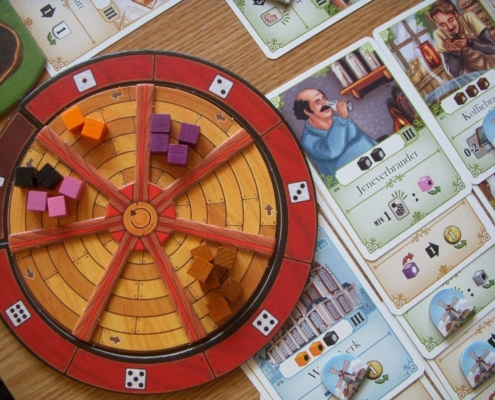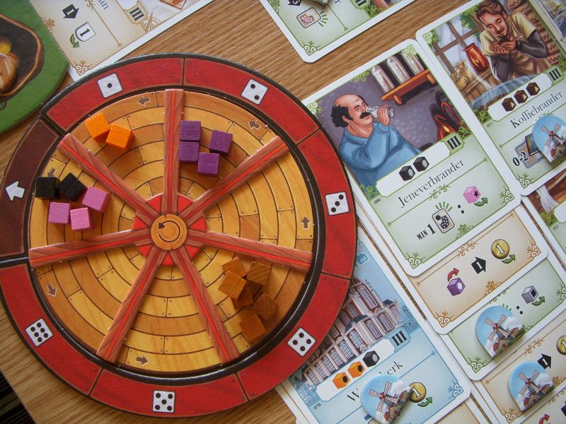 Jesteśmy w Holandii, zatem rozmawiamy po holendersku. W swojej dwujęzycznej angielsko-niemieckiej edycji gry, Queen Games zdecydowało się na zachowanie nazewnictwa kart w języku holenderskim. Tak karty budynków, jak i karty rzemieślników prezentują prawdziwe holenderskie nazwy miejsc i profesji. Nie wiedzieć czemu wzbudziło to niezadowolenie graczy. Mi ten zabieg się całkiem spodobał. Trudno chyba zrozumieć te kontrowersje, skoro zarówno grafiki kart, jak i zbliżone do języka angielskiego słowa raczej nie powodują problemów w rozgrywce. Czyż nie od razu wiadomo, że Koffiebrander to palacz kawy, a Tulpenteler to Pani Tulipanka? Czyż na ilustracjach nie widać dokładnie, że stojący przy desce serów Kaasmaker przygotowuje zapewne pizzę trzy sery, a Jeneverbrander wącha… klej? Kolejną bolączką graczy jest fakt, iż zwykła wersja gry zawiera talie kart z ikonami, bez napisów tłumaczących działanie każdej z nich. Ewentualne wątpliwości w działaniu kart należy więc rozstrzygać zaglądając do oddzielnej instrukcji z opisem ikon i kart. I tu już zupełnie serio nie widzę większego problemu, bo ikonografia gry jest bardzo czytelna i już po dwóch rozgrywkach zrozumienie działania każdej z kart nie nastręcza żadnych problemów. Co więcej, dla mnie takie rozwiązanie wpływa pozytywnie na płynność rozgrywki – osobiście nie znoszę konieczności czytania opisów na kartach; sto razy wolę, by autor przedstawił swoje idee w formie czytelnych ikon.