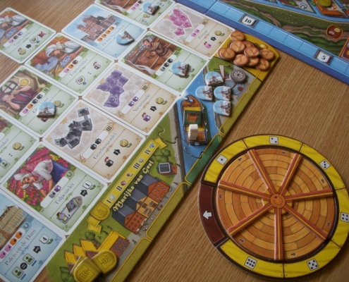 W grze znajdziemy też cztery mini dodatki. Tak dla urozmaicenia zapewne, bo jakieś szczególnie odkrywcze mechanicznie to one nie są. Dwa dodatkowe ludki: jeden przeznaczony do hasania po porcie, drugi do hasania po mieście, są proste w obsłudze. Tam, gdzie akurat stoją, tam mamy łatwiej. Ten z portu nagradza nas 2 dodatkowymi punktami za skitranie towaru w jego magazynie, zaś ten z miasta pozwala przejąć dzielnicę za jeden zasób mniej. Gracz, który z nich skorzysta, przestawia je w nowe miejsce. Drugi dodatek to sekretne kafle celów. Sekretne, bo do ich spełnienia niechcący mogą przyczynić się inni gracze, a dają one po prostu dodatkowe punkty na końcu rozgrywki. Są dość nierówne, jeśli chodzi o łatwość ich realizacji i wydały mi się jak dotąd najbardziej losowym elementem gry. Trzeci dodatek to sam Stefan Feld, we własnej kartonowej osobie. Gość dorabia na czarnym rynku. Jeśli sprzedamy mu towar, którego akurat potrzebuje, nagrodzi nas dwoma bonusami zamiast jednego: to duże wzmocnienie. W rozgrywkach z Feldem wszyscy gracze biegną najpierw do niego (bynajmniej nie po autograf) sprzedając co się da. Zaś czwarty dodatek to kafle rynku, których używać możemy wymiennie z kaflami z podstawowej wersji. Ja ten dodatek lubię chyba najbardziej, bo kafle te oferują dużo ciekawsze nagrody niż nudne punkty zwycięstwa. Generalnie każdy z dodatków stanowi duże ułatwienie w rozgrywkach i już od naszej decyzji zależeć będzie, który z nich dołączymy do rozgrywki i jak wysoko ustawimy sobie poprzeczkę w danej partii.
