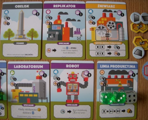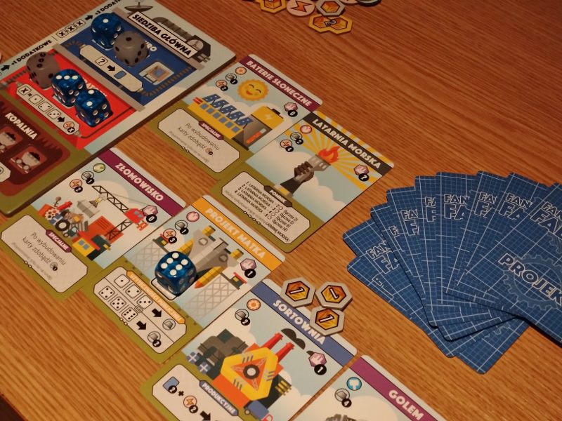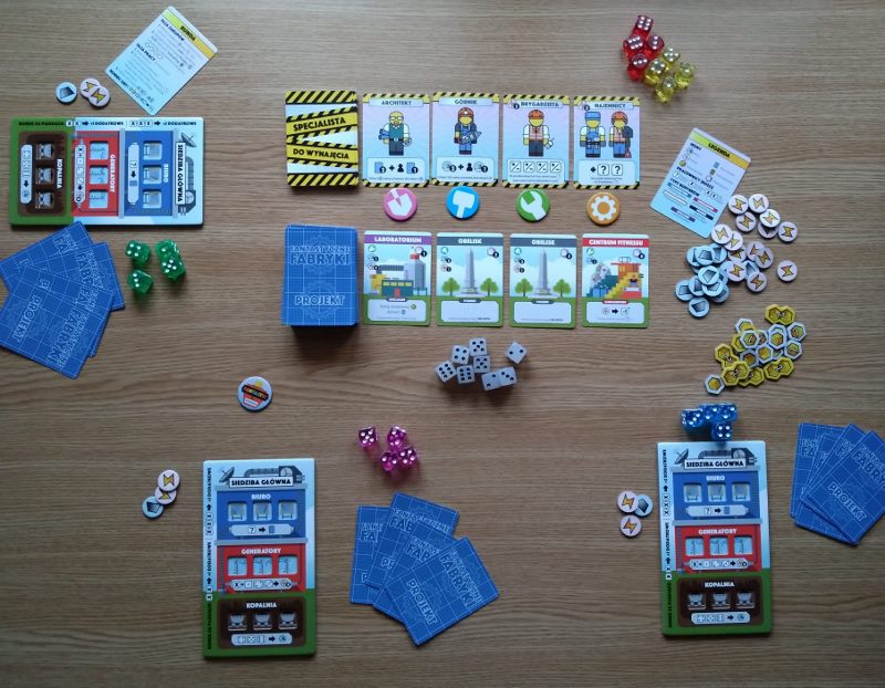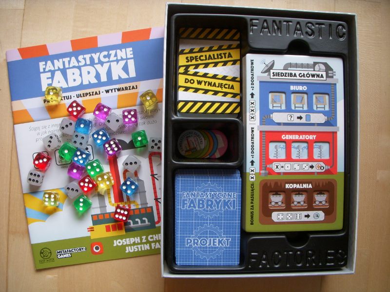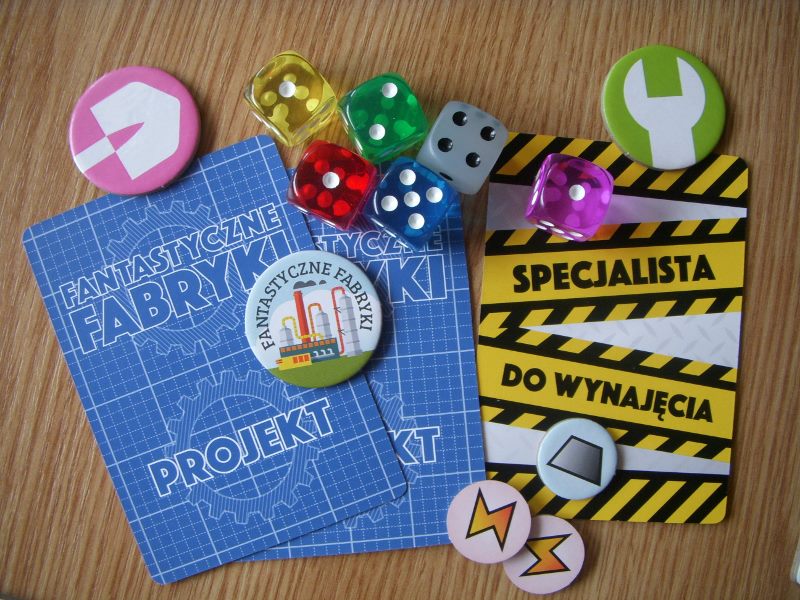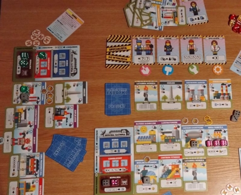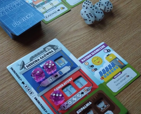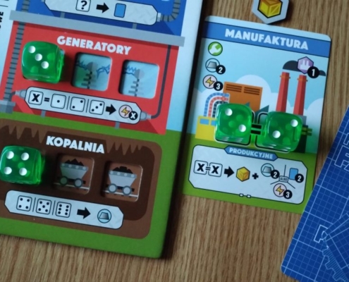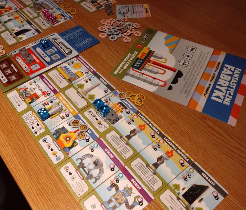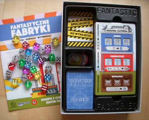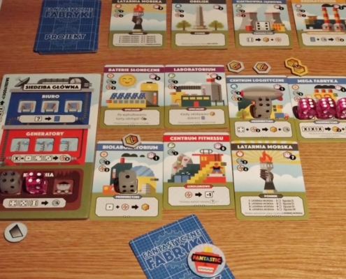 Fabryki, nie dość, że fantastyczne, to jeszcze są kolorowe. Karty projektów śmieją się do nas żółtymi słoneczkami i czerwonymi kominami, ale całą robotę i tak robią kości. To w końcu pracownicy. Ładne i barwne, lekko przezroczyste, błyszczące, w sześciu barwach. Wielbiciele potrząsania i rzucania powinni być zadowoleni. Wielbiciele kościanych manipulacji również. Ilustracje kart, prezentujące industrialne przecież obiekty, są przyjazne. Przypominają grafiki z dziecięcych kreskówek, ale ta prosta, geometryczna stylistyka jest bardzo czytelna podczas rozgrywek. Całość tej solidnie zaprojektowanej gry uzupełniają planszetki graczy z wgłębieniami na lokowanie kości, grube znaczniki i żetony, dobrze pomyślana wypraska i bardzo dobrze napisana instrukcja. Pierwsze wrażenie jest bardzo dobre.