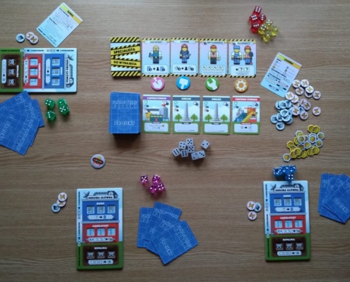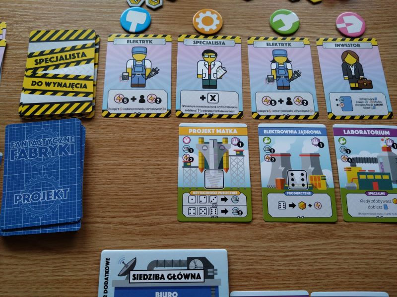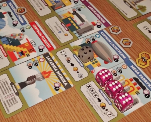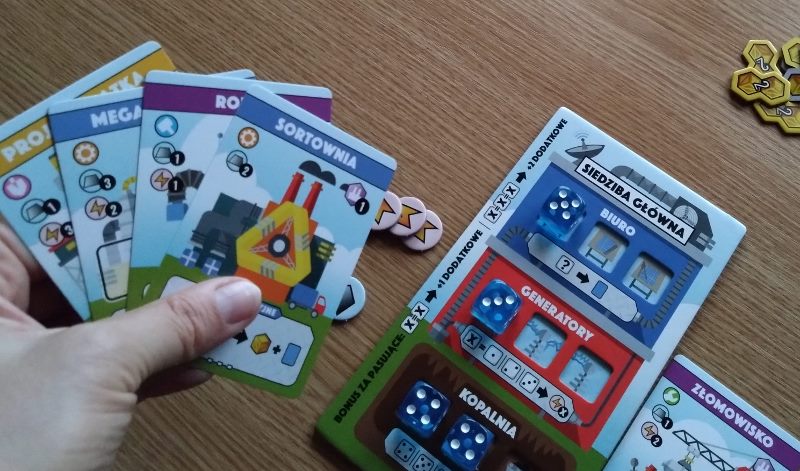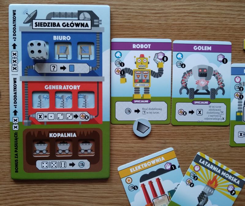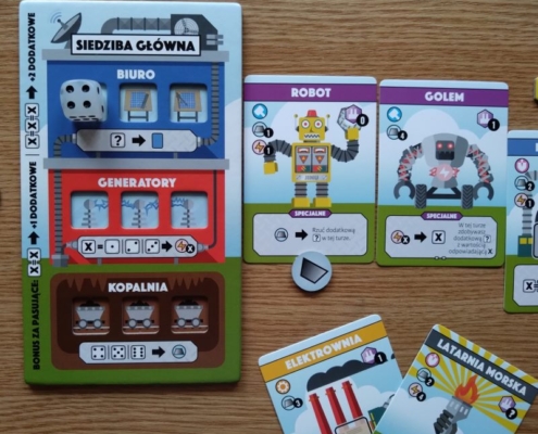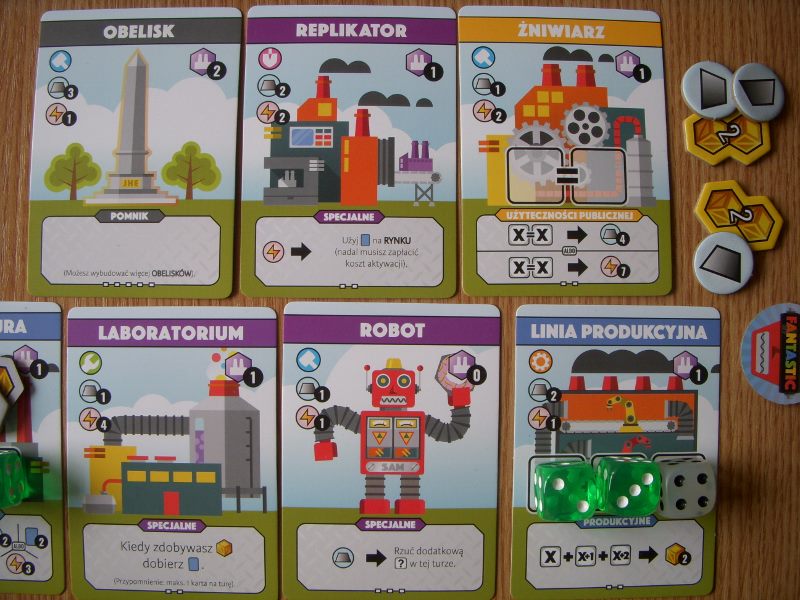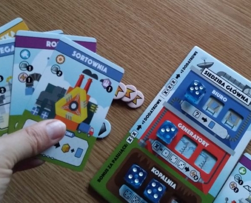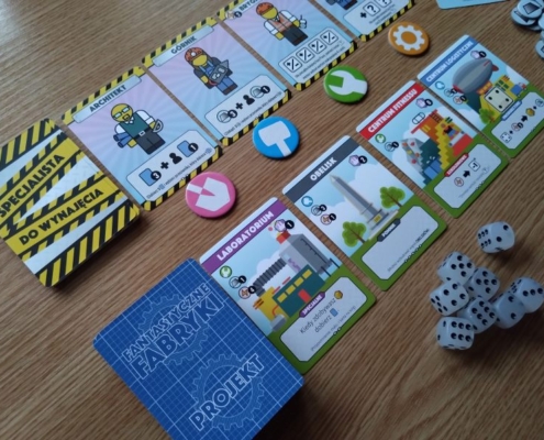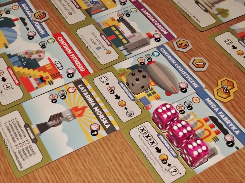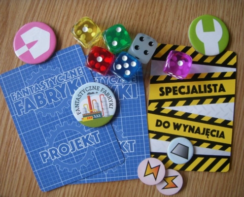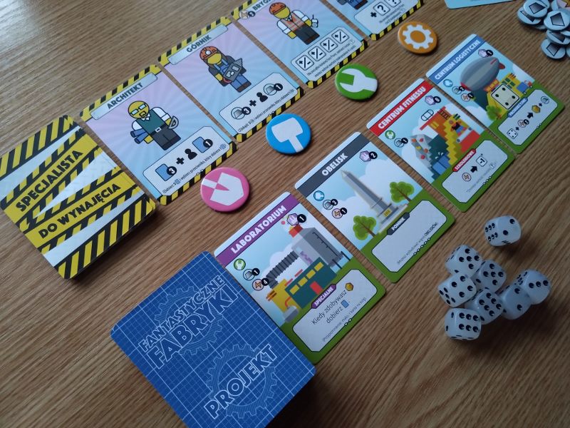 Fabryki, nie dość, że fantastyczne, to jeszcze są kolorowe. Karty projektów śmieją się do nas żółtymi słoneczkami i czerwonymi kominami, ale całą robotę i tak robią kości. To w końcu pracownicy. Ładne i barwne, lekko przezroczyste, błyszczące, w sześciu barwach. Wielbiciele potrząsania i rzucania powinni być zadowoleni. Wielbiciele kościanych manipulacji również. Ilustracje kart, prezentujące industrialne przecież obiekty, są przyjazne. Przypominają grafiki z dziecięcych kreskówek, ale ta prosta, geometryczna stylistyka jest bardzo czytelna podczas rozgrywek. Całość tej solidnie zaprojektowanej gry uzupełniają planszetki graczy z wgłębieniami na lokowanie kości, grube znaczniki i żetony, dobrze pomyślana wypraska i bardzo dobrze napisana instrukcja. Pierwsze wrażenie jest bardzo dobre.