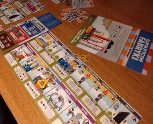 Fantastyczne fabryki to bardzo solidna propozycja w kategorii niedługich gier średniozaawansowanych. Jest bardzo przejrzysta w konstrukcji, nietrudna w obsłudze, czytelna w projekcie graficznym. Bez problemu wytłumaczymy ją nawet początkującym graczom. Zabawa w tworzenie działającego silniczka produkcyjnego oraz kombowanie zdolności kart powinny zachęcić do rozgrywki również bardziej zaawansowanych graczy. Partie są szybkie, głównie dzięki temu, iż wszyscy rozgrywają swoje tury jednocześnie. Czuć w nich presję wyścigu o jak najszybsze wyprodukowanie dwunastu towarów i wystawienie jak najwyżej punktowanych kart. Jak na grę o fabrykach i automatach przystało, może wydawać się nieco bezduszna, ale temat budowania kolejnych fabryk świetnie współgra z mechaniką. Toż to gra o budowaniu silniczka produkcyjnego, zazębianiu się jednej akcji z drugą, wykorzystaniu synergii. Mnie ta gra wciągnęła. Doceniam jej bardzo szybkie tempo, a nawet lekki niedosyt z jakim zazwyczaj pozostaję po zakończeniu rozgrywki. Lubię rozkminkę związaną z planowaniem kolejności budowy i aktywacji kart oraz zabawę kośćmi: próby wyciskania jak najlepszego wyniku z losowego rzutu.