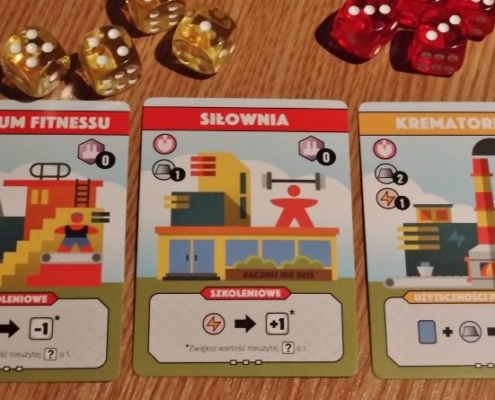 Fantastyczne fabryki nie silą się na tworzenie żadnej fabularnej opowieści. Fabryka to nie miejsce na epickie doznania. To solidna maszyneria. Jednak muszę z ironicznym uśmiechem przyznać, że klimat pracy udało się tu autorom odtworzyć znakomicie. Te bezosobowe postaci specjalistów, profesjonalne do bólu: w kaskach, za to bez rysów twarzy. Nawet robot okazuje tu więcej emocji. Kolorowe wesołe fabryczki zestawiono z szarymi monumentalnymi pomnikami przynoszącymi twarde i rzeczowe punkty zwycięstwa. Sposób działania każdej karty jest ciekawie przemyślany. Wśród kart szkoleniowych, pozwalających na modyfikacje wartości oczek wyrzuconych na kościach, znajdziemy i centrum fitnessu, które odchudzi nam kość o jedno oczko, i siłownię, która doda naszej kości mocy. Dla wielbicieli czarnego humoru znajdzie się też krematorium.