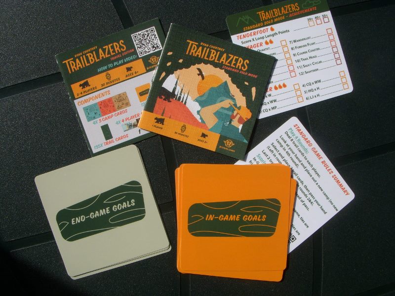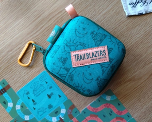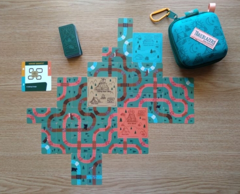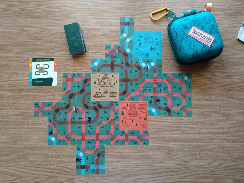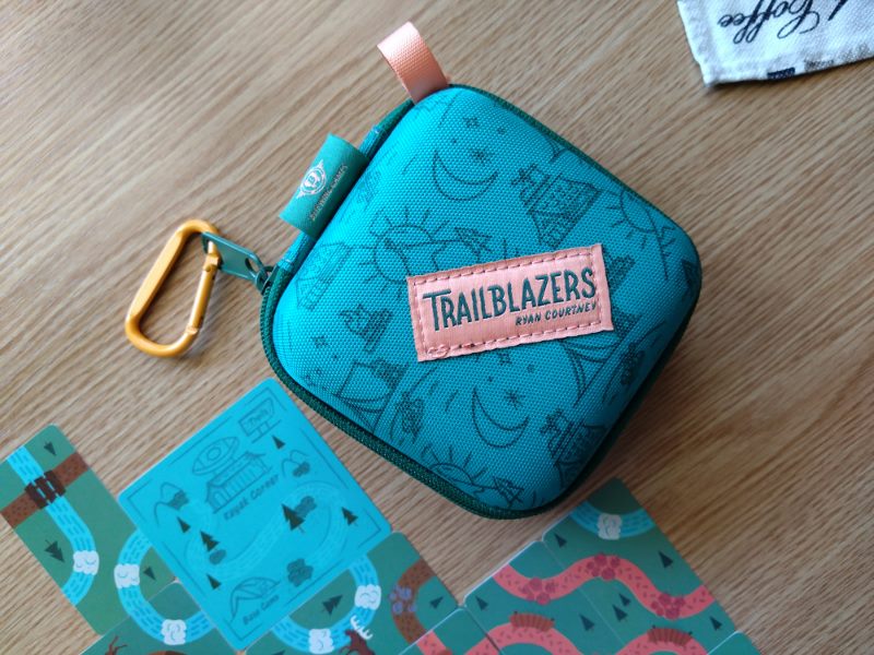 Już samo opakowanie gry Trailblazers: niewielki turkusowy pojemnik z suwakiem, który można przypiąć do plecaka, zapowiada grę niesztampową. To gra oparta na drafcie i polegająca na budowaniu przed sobą tableau z dobranych kart: plątaniny kolorowych ścieżek. Autorem gry jest Ryan Courtney, który wydaje się bardzo zafascynowany ideą tworzenia połączeń budowanych z poplątanych dróg, czy systemów rur – w jego poprzednich grach: Curious Cargo i Pipeline spotkamy podobną łamigłówkę. Trailblazers w zamyśle ma być grą prostszą i przeznaczoną dla bardziej rodzinnych graczy. Została wydana przez wydawnictwo Bitewing Games. W prezentowanej tu wersji: Super Travel Edition gra przeznaczona jest dla 1 do 4 graczy.