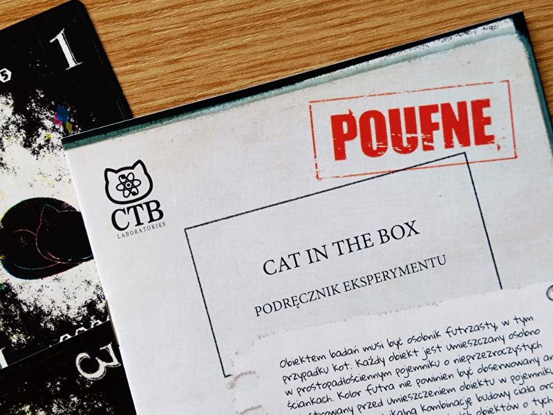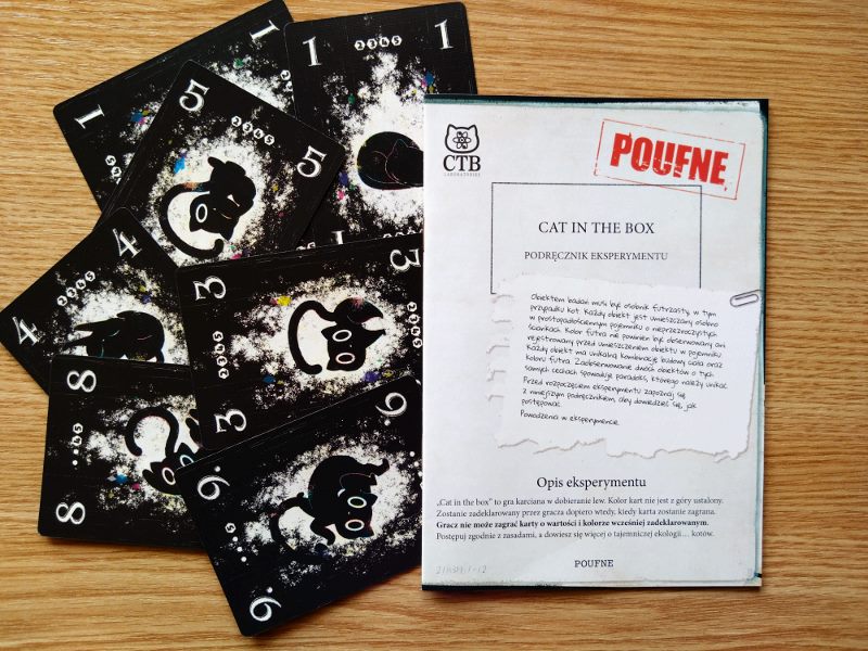 Czarny kot już nie przynosi pecha, przynosi nowe możliwości. Cat in the Box to nie tylko nowatorski pomysł zagrywania czarnej karty i deklarowania jej koloru, czy zabawa w grupowanie znaczników swego koloru na planszy badań. To jest gra, która świetnie włącza temat nowoczesnej fizyki do codziennych rozgrywek i pozwala bawić się koncepcjami współczesnej nauki w sposób zupełnie rozbrajający. To gra, w której patrząc na rękę swych czarnych kart z zatroskaniem stwierdzam: no nie mam już zielonego koloru, mam za to tę czerwoną ósemką, cóż poradzę, że muszę ją zagrać. No nie mam już żółtych kart, i co mi zrobisz. Przyjrzyj się jak wybitnie czerwona jest ta karta. Dylematy trick taking-u w tym kocim wydaniu różnią się nieco od dylematów typowych gier w zbieranie lew. Tu nie musimy już pamiętać jakie wartości w danym kolorze zeszły; mamy to jasno zobrazowane na planszy badań. Tu musimy się martwić o nie dopuszczenie do paradoksu, próbujemy zatem szybko zejść z kart o takich wartościach, których mamy więcej. W całej talii jest po 5 kart o wartościach od 1 do 9, zaś na planszy badań zdołamy umieścić zaledwie cztery jednakowe wartości. Bardzo ważna jest decyzja podejmowana na początku partii, o tym którą z kart na ręce odrzucimy od razu do pudełka. Ważna jest decyzja, kiedy bezpiecznie ogłosić, iż nie będziemy zagrywać kart w danym kolorze. Obstawianie liczby zdobytych lew jest z kolei elementem dającym emocje podczas gry. Próby zgrania tego wszystkiego podczas rozgrywki: wygrania wskazanej liczby lew, zgrupowania znaczników badań, uniknięcia paradoksu dostarczają nam kawał niezwykłej rozkminki.