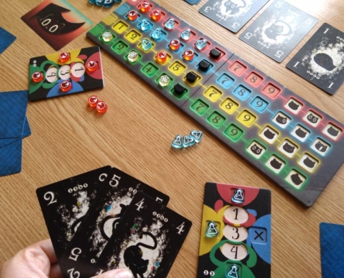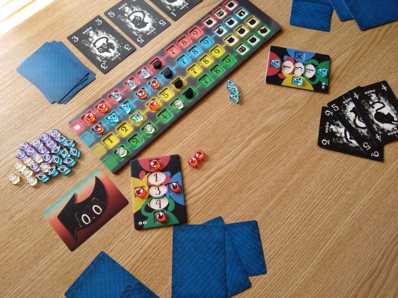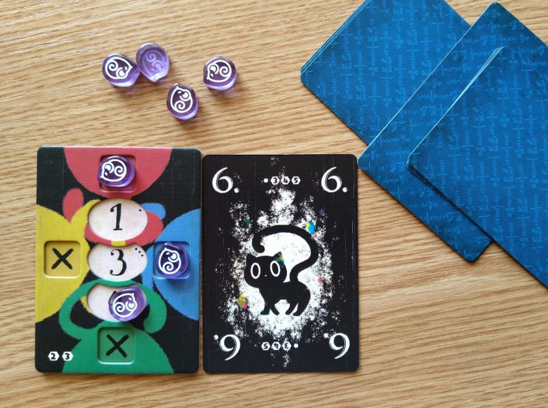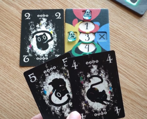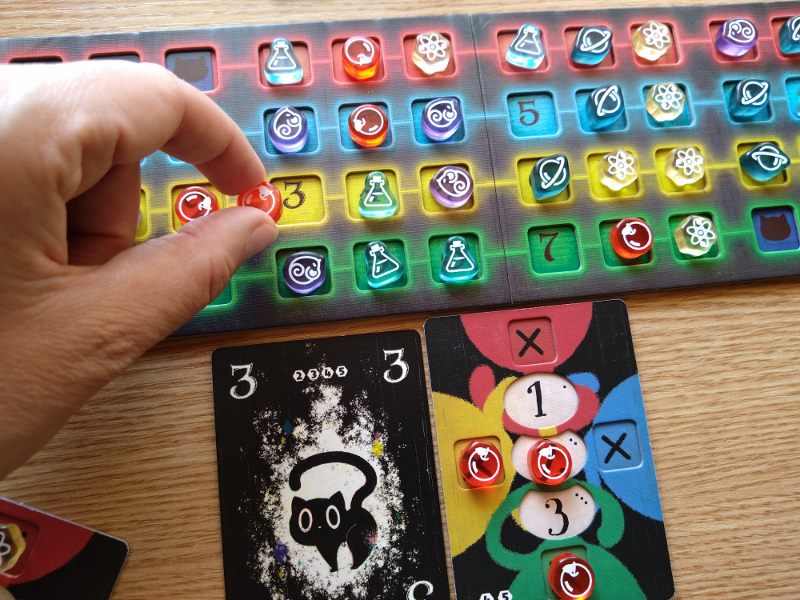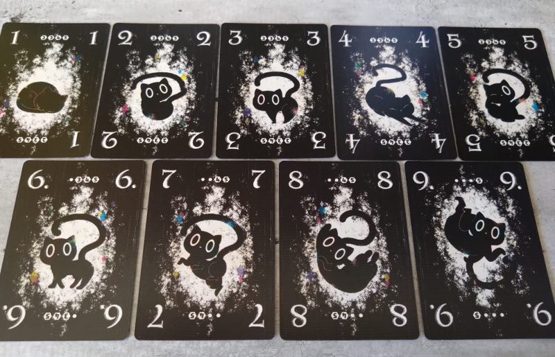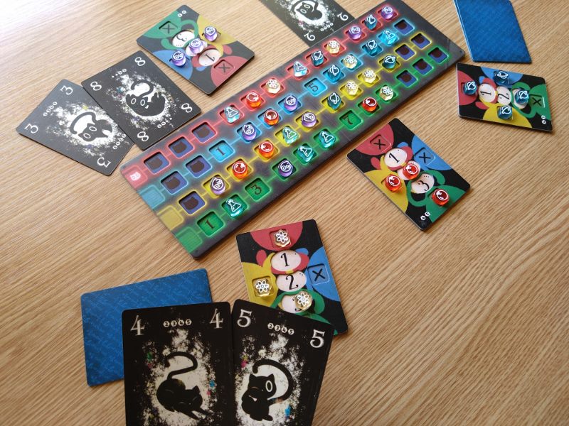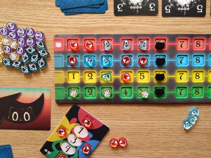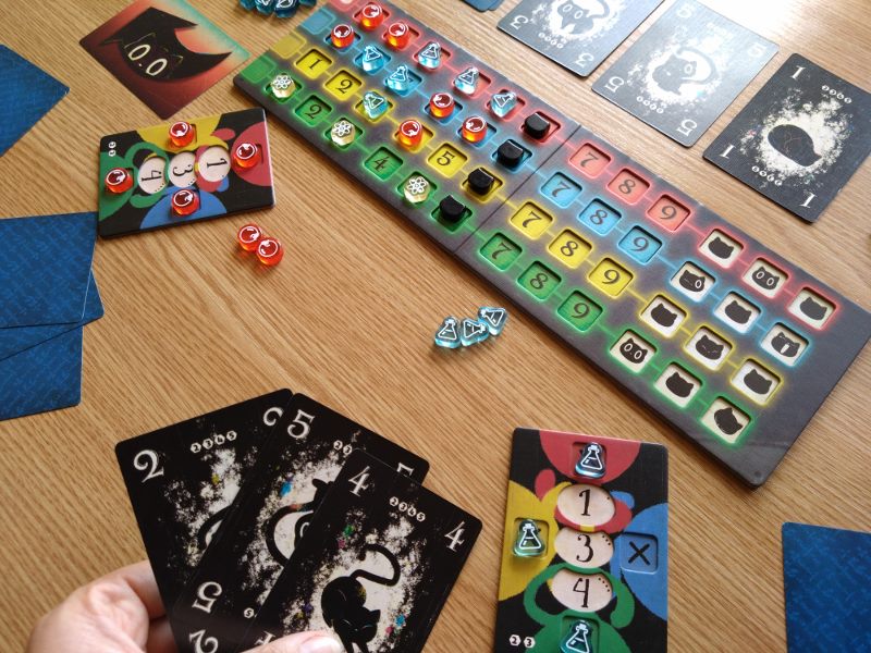 Nie ma co kryć, że to genialny i bardzo innowacyjny pomysł na rozgrywkę. Sztuczka z deklarowaniem koloru dopiero przy wykładaniu karty zaczyna wykręcać nam umysł w niespotykany dotąd sposób. Każdy gracz ma przed sobą planszetkę, której cztery boki oznaczone są czterema kolorami. Na środku stołu umieszcza się planszę badań z torami wartości w każdym z czterech kolorów. Gracz zagrywając kartę czarnego kota z ręki umieszcza ją przy jednej z krawędzi swej planszetki w ten sposób określając jej kolor. Następnie umieszcza jeden ze swoich znaczników na planszy badań w kratce odpowiadającej wartości zagranej karty i zadeklarowanemu kolorowi. Gracz nie może zagrać karty o wartości i kolorze już wcześniej przez kogoś zadeklarowanym. To spowodowałoby paradoks.