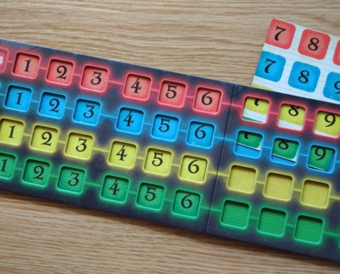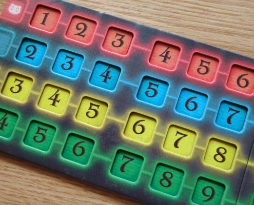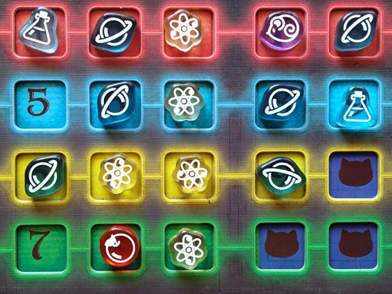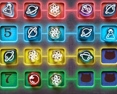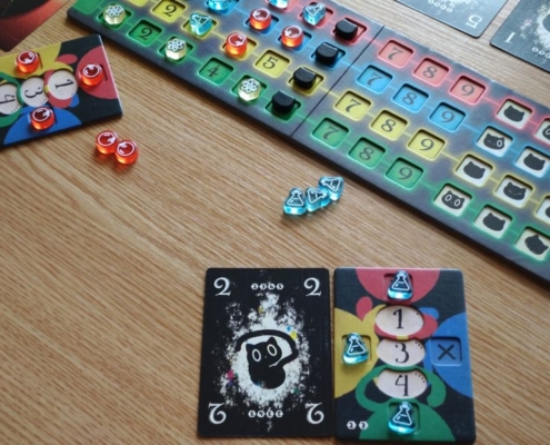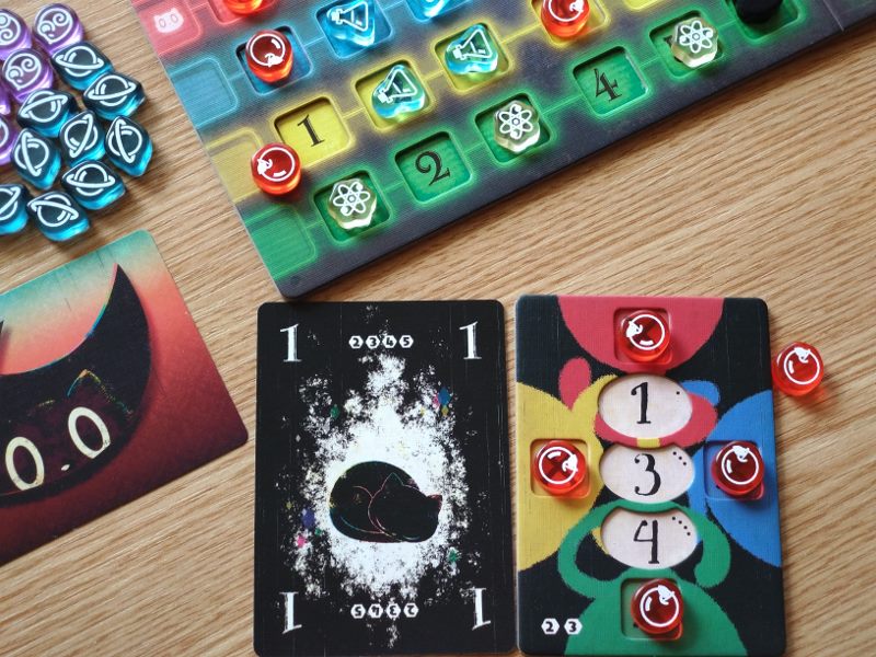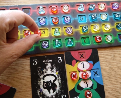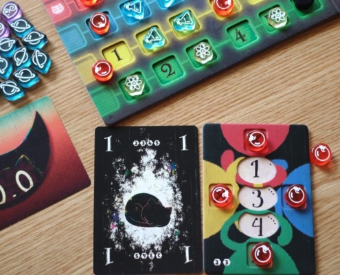 To również nie wszystko, gdyż Cat in the Box jest grą, w której obok zbierania lew spotkamy się również z elementami mechaniki area control. Znaczniki w kolorach graczy rozmieszczane na planszy badań mogą również przynieść punkty za największą ich grupę stykającą się bokami. Taką premię punktową gracz zdobędzie jednak tylko wtedy, gdy zbierze dokładnie tyle lew, ile zadeklarował przed rozgrywką. Na samym początku partii, po rozdaniu kart, gracze obstawiają ile lew chcą zdobyć w tym rozdaniu umieszczając swój znacznik na wybranej wartości na swojej planszetce.