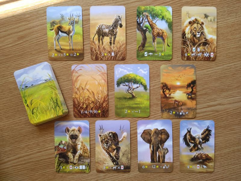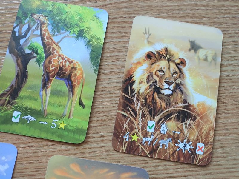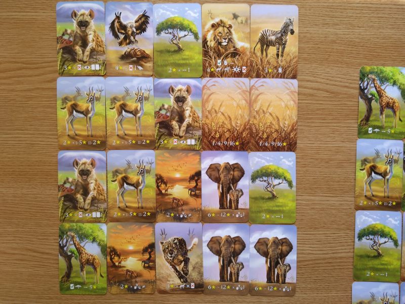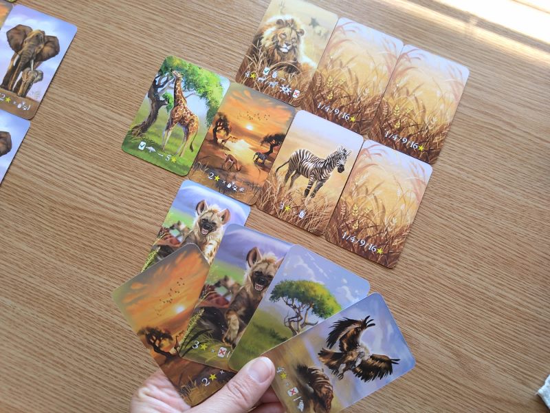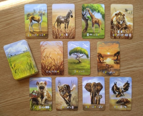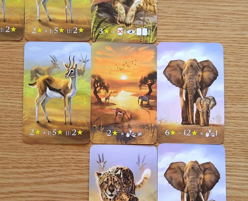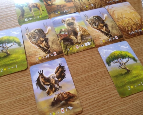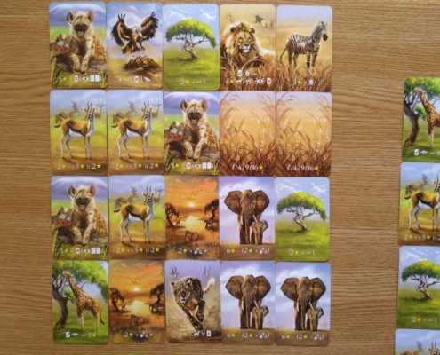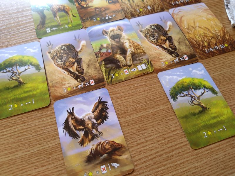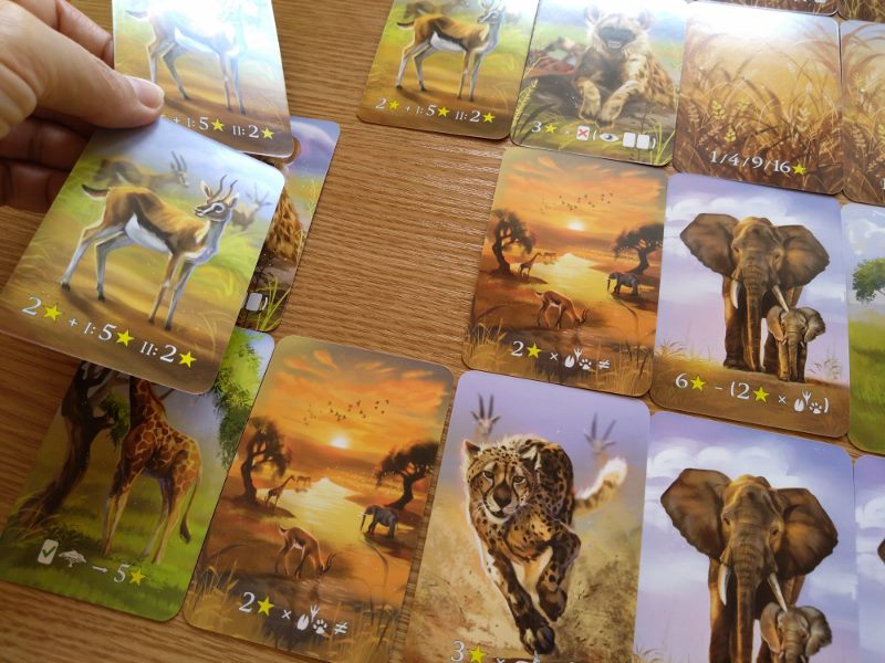 Końcowe punktowanie przeprowadzamy zgodnie z kolejnością przedstawioną w notesie punktacji, najpierw ciesząc się punktami za grupy traw, rzędy i kolumny w których rośnie akacja, oraz różnorodność zwierząt przy wodopoju. Każda z pięknych gazeli da nam po dwa punkty, a gdy prześcigniemy rywali w ich liczbie dostaniemy premię. Zebra odpłaci nam punktami jeśli skojarzymy ją z trawą, a żyrafa ucieszy się z rosnącej obok akacji. W tym miejscu kończy się sielanka. Nadbiega gepard lub nawet stado gepardów, które wymorduje każdą gazelę niefortunnie usytuowaną w linii po skosie od geparda. Jak to dobrze, że już policzyliśmy za nią punkty. Upolowane gazele wyjmujemy z naszego tableau i odrzucamy z gry. Teraz kolej na dostojnego lwa, który zadowoli się jednym zwierzątkiem, o ile mógł spokojnie wygrzać się w pobliżu trawy. Upolowana zebra lub niepożarta dotąd przez gepardy gazela traci życie w tym momencie i opuszcza naszą sawannę. Gdy już ucichnie echo kroków słonia, który może przynieść całe 6 punktów o ile nie przebywa zbyt długo w towarzystwie pośledniejszych gatunków, do gry wkraczają padlinożercy. Hiena przyniesie nam aż trzy punkty za każde zwierzę upolowane wcześniej przez gepardy lub lwy, o ile znajdzie się w pobliżu dwóch kroków. Zaś sęp spadnie z góry na padlinę (czyli puste miejsca po usuniętych kartach zebr i gazeli) w tej samej kolumnie.