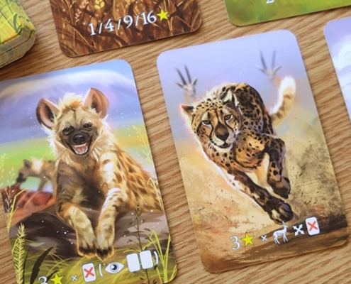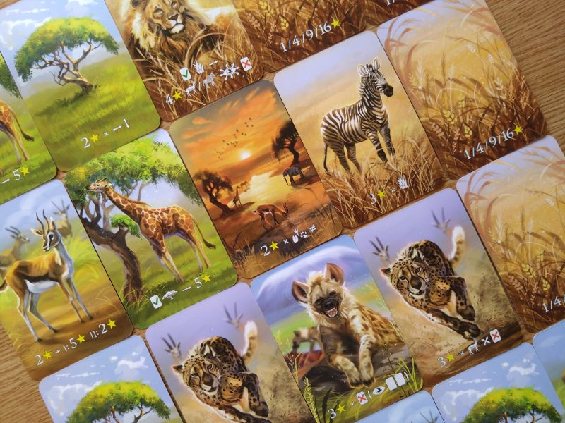 Ta odsłona Ekosystemu jest bardzo intuicyjna. Po jednokrotnym zapoznaniu się z kartą pomocy przedstawiającą reguły punktowania każdego gatunku, znamy już wszystko na pamięć. Pozostaje nam skupić się na samej rozgrywce, a nie na doczytywaniu zależności między gatunkami. Dokładając stopniowo karty do naszego tableau, musimy mieć już w głowie choć zarys docelowego wyglądu tej sawanny. Musimy myśleć tu z wyprzedzeniem i rozważać w głowie kilka rodzajów punktowania naraz. Dokładając pasiastą zebrę obok kępy traw, bardzo chcielibyśmy mieć przy tej kępie też lwa, a w okolicy kilka hien lub chociaż sępa zawieszonego nad nieświadomą jeszcze niczego zebrą. Idealnie byłoby gdyby te hieny skorzystały też z usuniętych kart gazeli, ale do tego potrzebujemy szybkonogiego geparda sprytnie ukrytego gdzieś po przekątnej. Oczywiście możemy też wypróbować inne sposoby grania i wykorzystać moc stada słoni, czy zgrupowania traw lub nasadzenia w naszej sawannie rzędów i kolumn punktujących akacji. Ta odsłona Ekosystemu zachęca do wypróbowania różnych strategii i połączeń. Ale to właśnie reguły i kolejność polowania narzucają charakterystyczny styl tej części Ekosystemu.